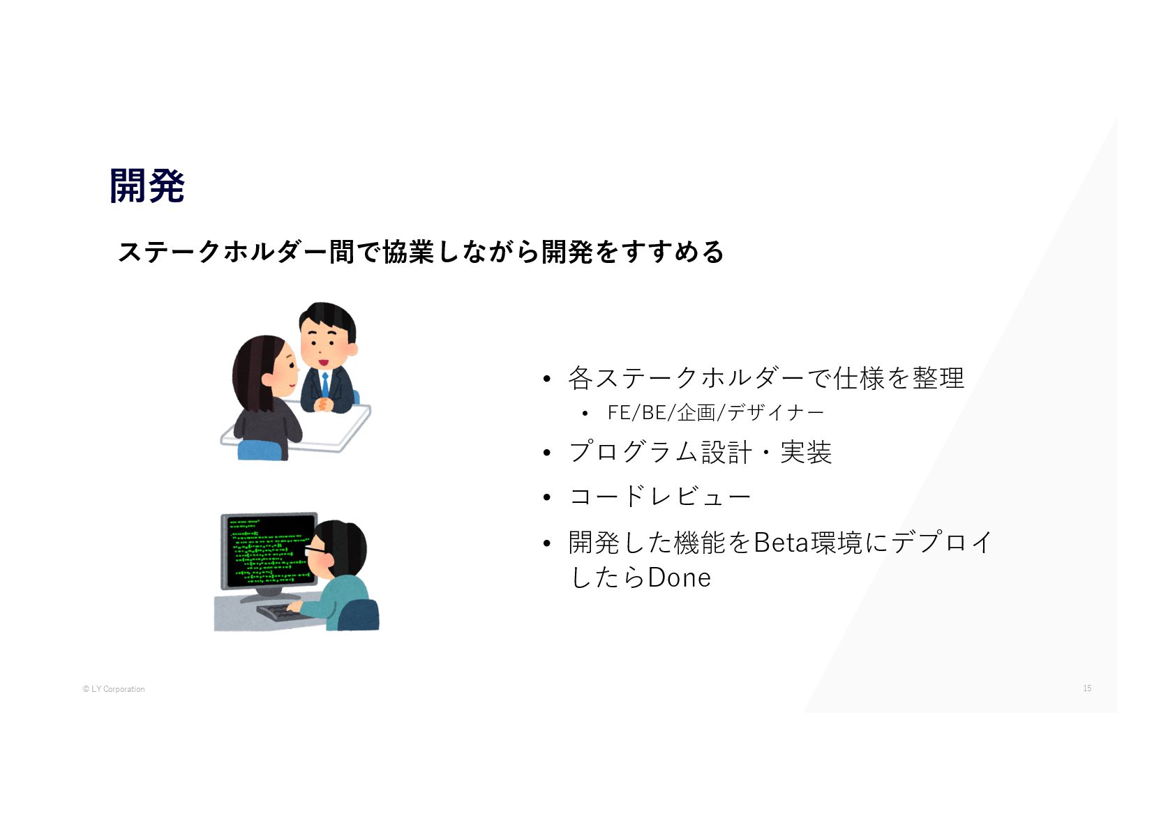 © LY Corporation 15 開発 ステークホルダー間で協業しながら開発をすすめる • 各ステークホルダーで仕様を整理 • FE/BE/企画/デザイナー
