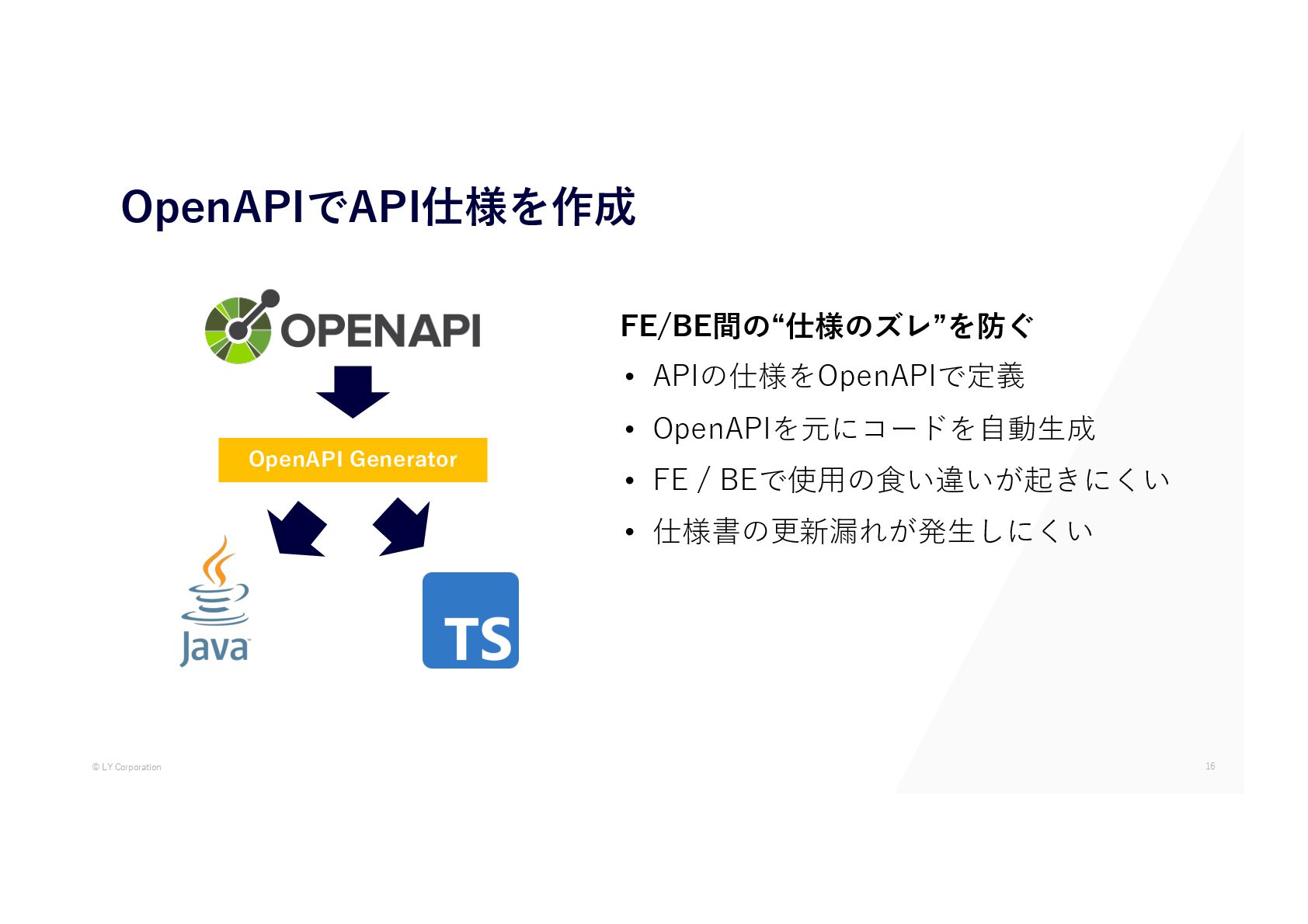 © LY Corporation 16 OpenAPIでAPI仕様を作成 OpenAPI Generator FE/BE間の“仕様のズレ”を防ぐ • APIの仕様をOpenAPIで定義