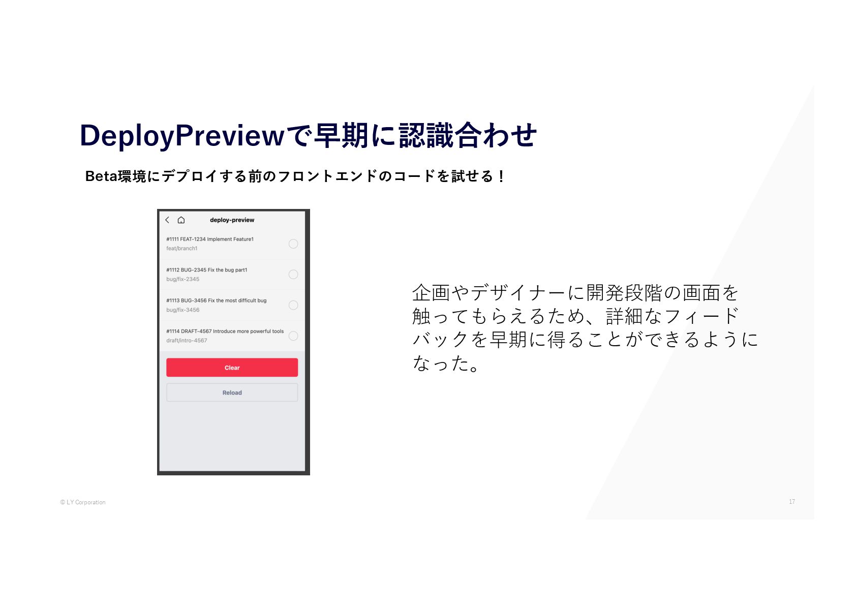 © LY Corporation 17 DeployPreviewで早期に認識合わせ Beta環境にデプロイする前のフロントエンドのコードを試せる! 企画やデザイナーに開発段階の画⾯を 触ってもらえるため、詳細なフィード バックを早期に得ることができるように なった。