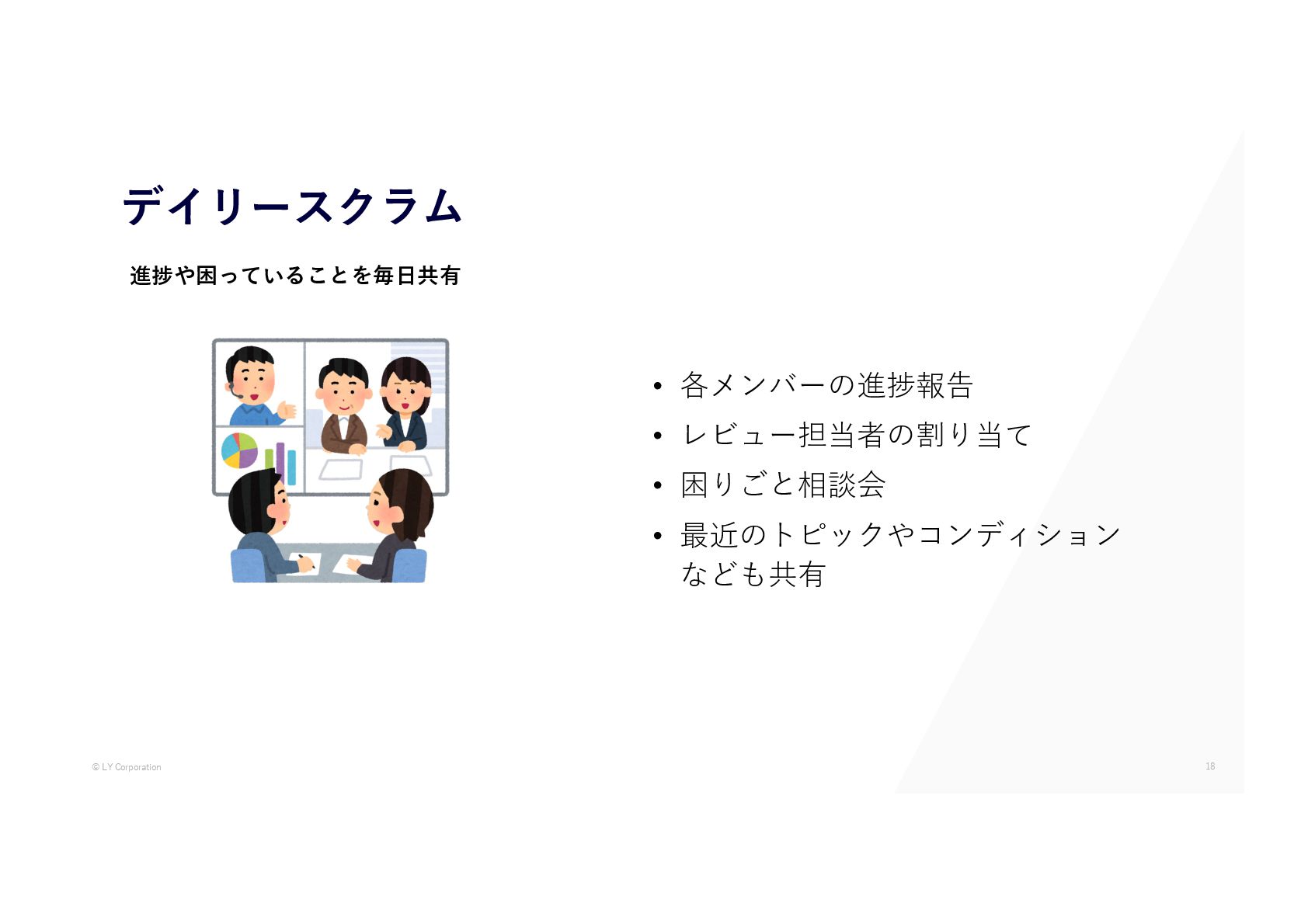 © LY Corporation 18 デイリースクラム 進捗や困っていることを毎⽇共有 • 各メンバーの進捗報告 • レビュー担当者の割り当て