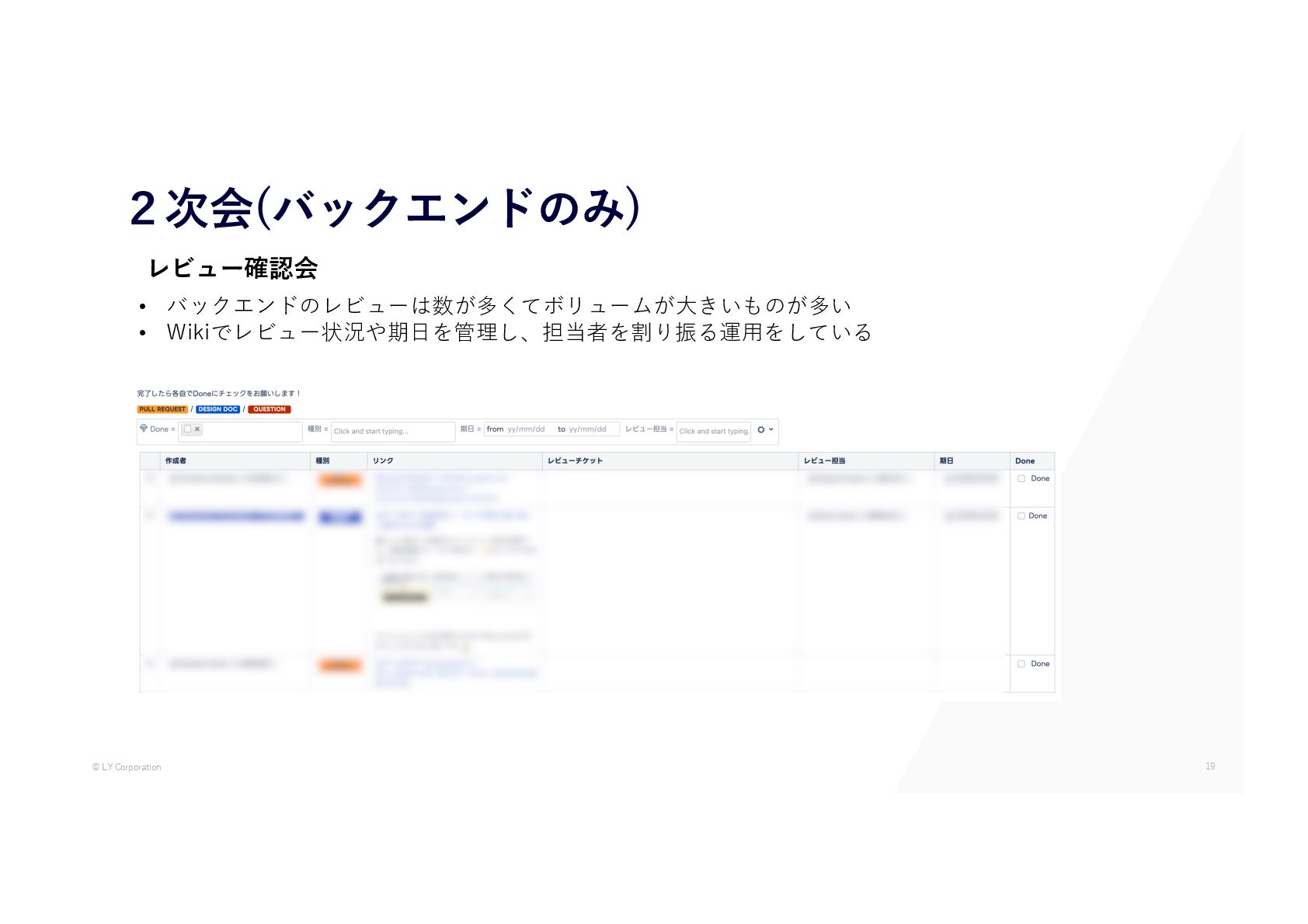 © LY Corporation 19 2次会(バックエンドのみ) • バックエンドのレビューは数が多くてボリュームが⼤きいものが多い • Wikiでレビュー状況や期⽇を管理し、担当者を割り振る運⽤をしている レビュー確認会
