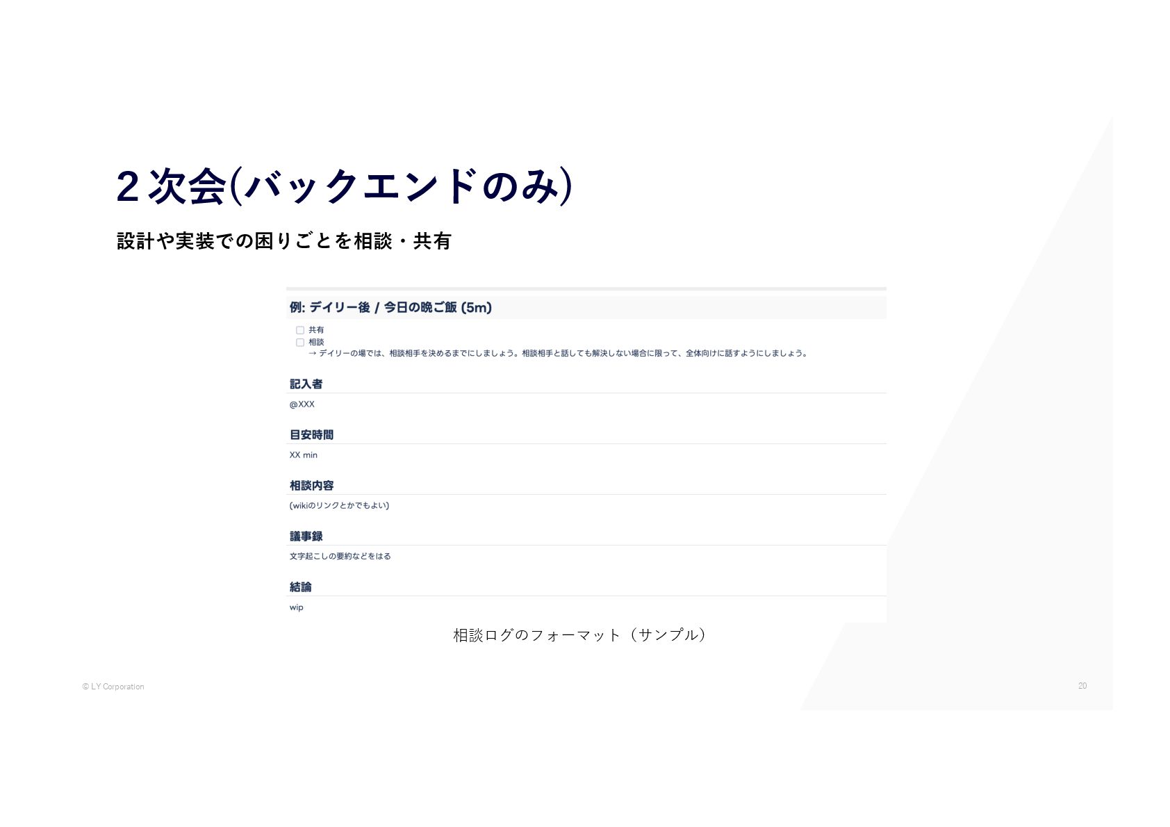 © LY Corporation 20 2次会(バックエンドのみ) 設計や実装での困りごとを相談・共有 相談ログのフォーマット(サンプル)