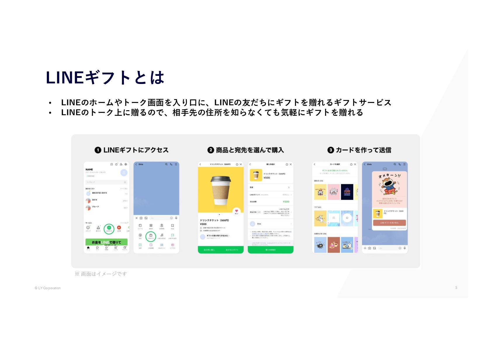 © LY Corporation LINEギフトとは 3 • LINEのホームやトーク画⾯を⼊り⼝に、LINEの友だちにギフトを贈れるギフトサービス • LINEのトーク上に贈るので、相⼿先の住所を知らなくても気軽にギフトを贈れる ※