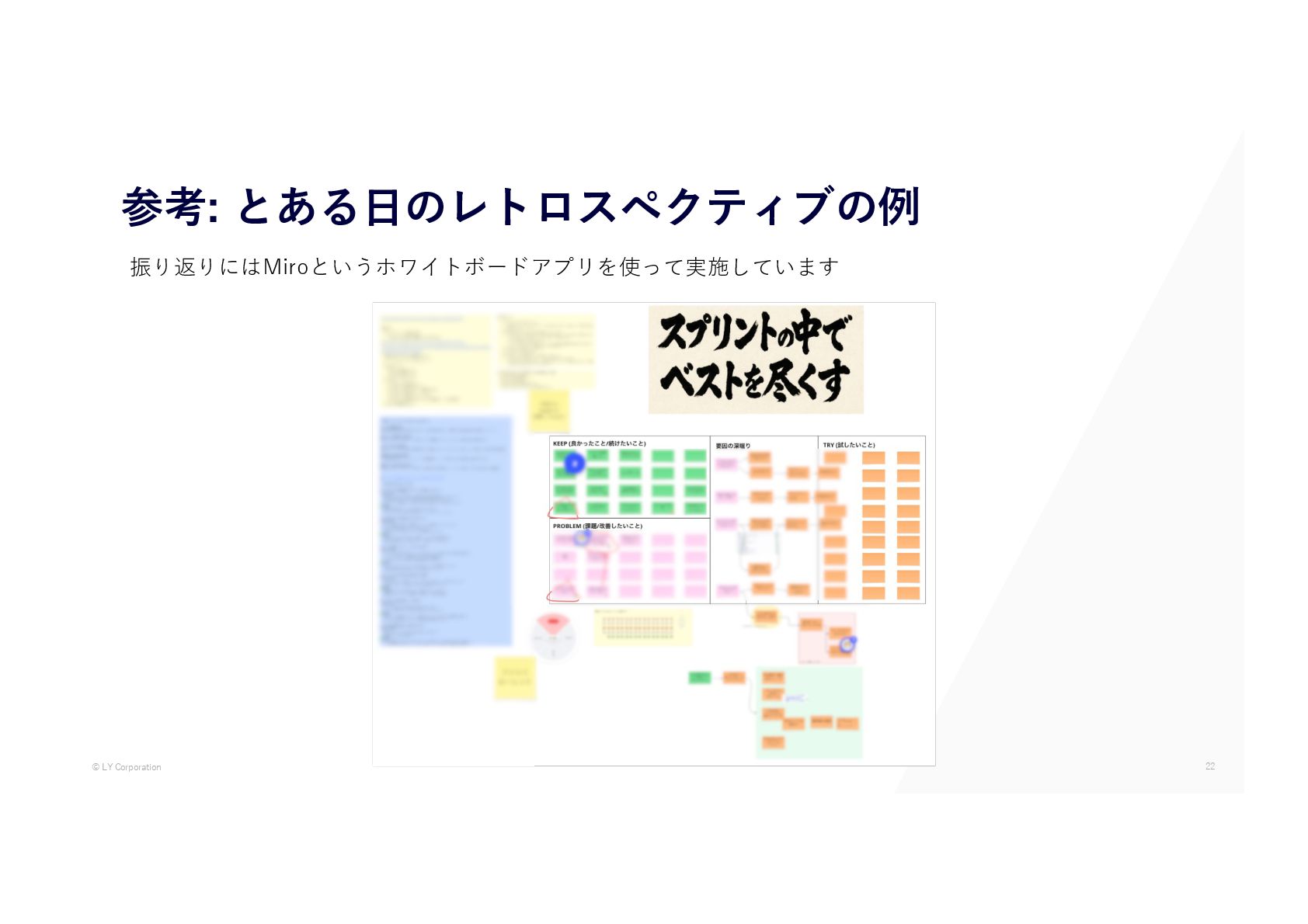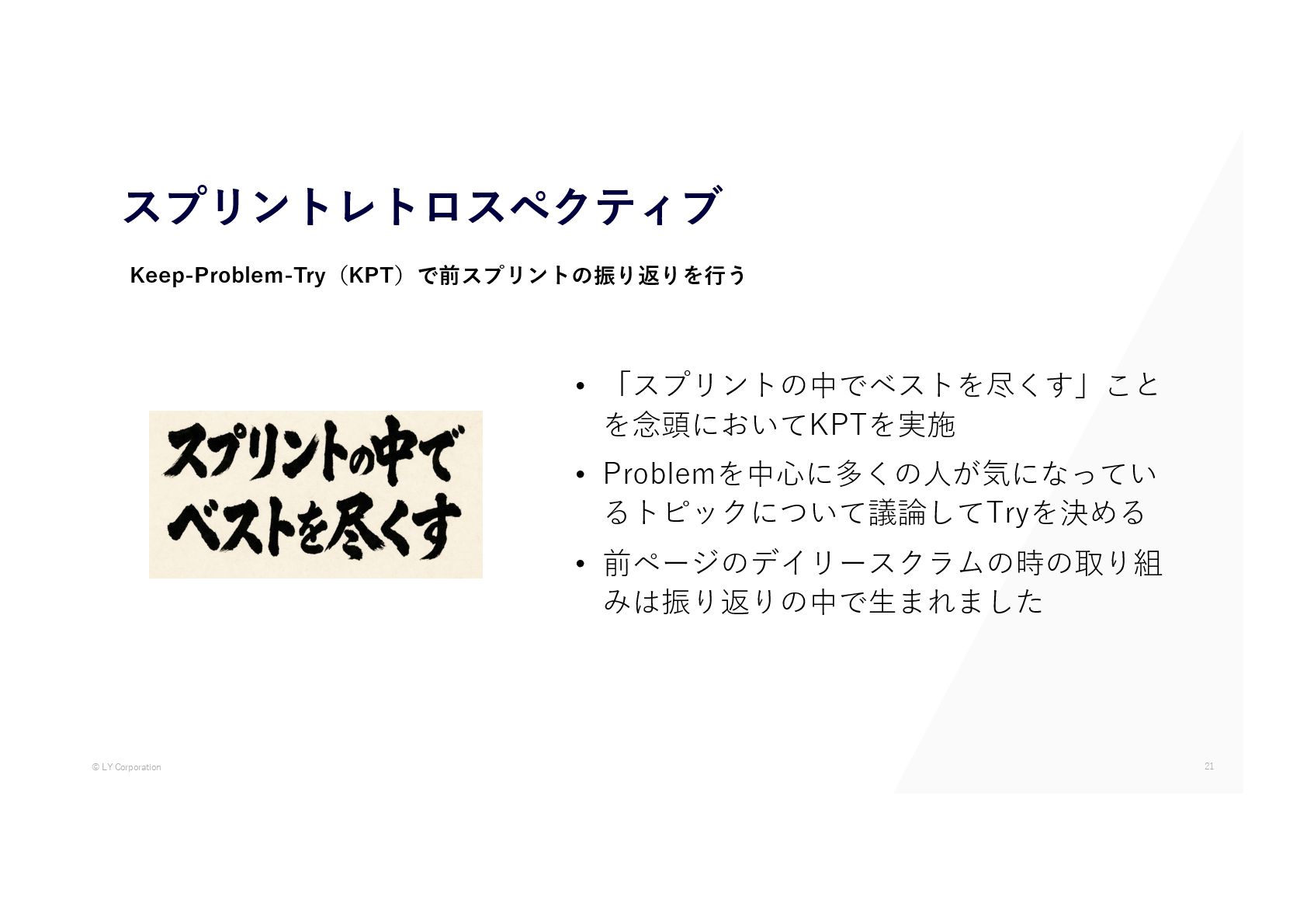 © LY Corporation 21 スプリントレトロスペクティブ Keep-Problem-Try(KPT)で前スプリントの振り返りを⾏う • 「スプリントの中でベストを尽くす」こと を念頭においてKPTを実施 •