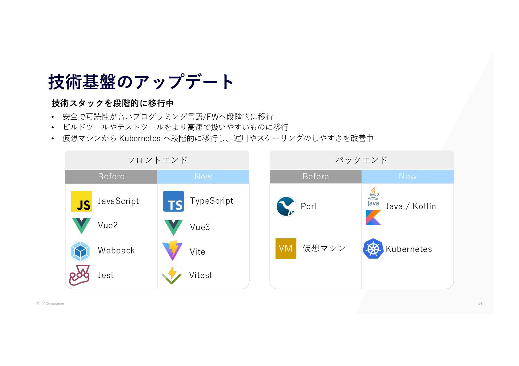 © LY Corporation 24 技術基盤のアップデート フロントエンド バックエンド Before Before Now