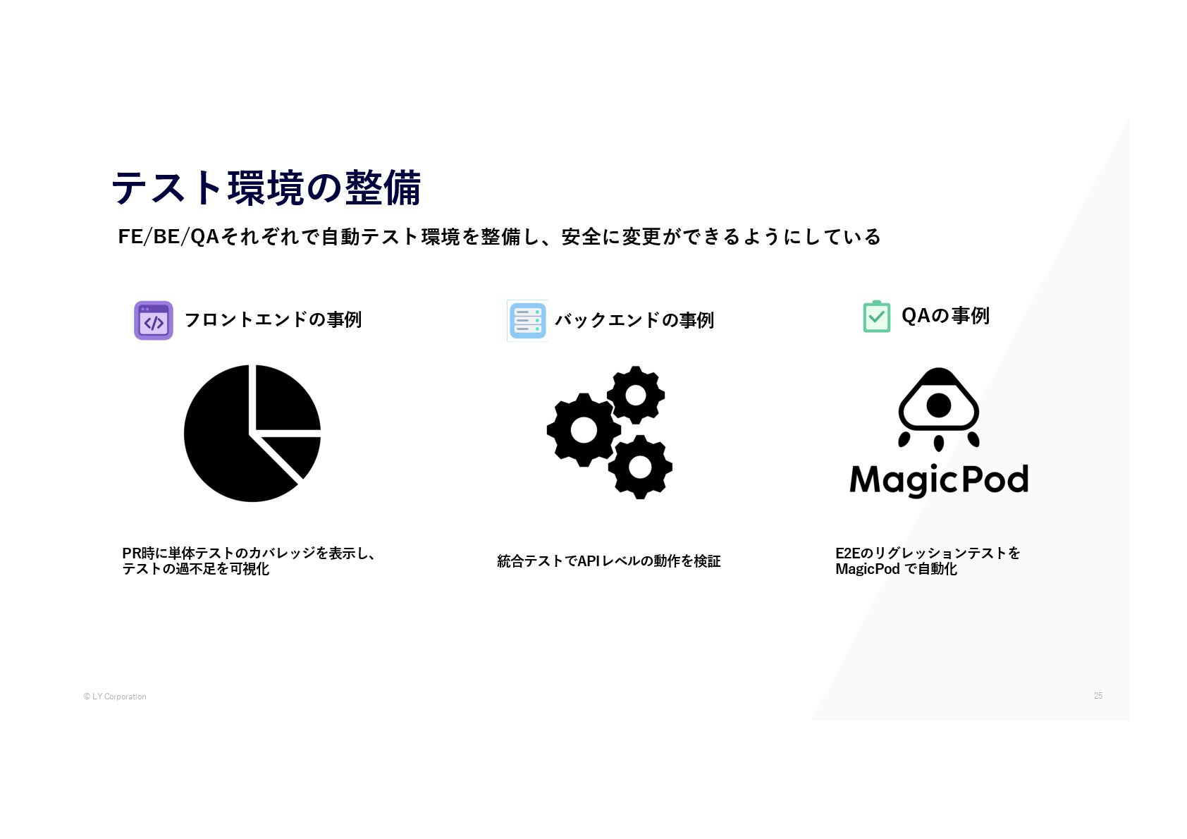 © LY Corporation 25 テスト環境の整備 FE/BE/QAそれぞれで⾃動テスト環境を整備し、安全に変更ができるようにしている PR時に単体テストのカバレッジを表⽰し、 テストの過不⾜を可視化 QAの事例 統合テストでAPIレベルの動作を検証