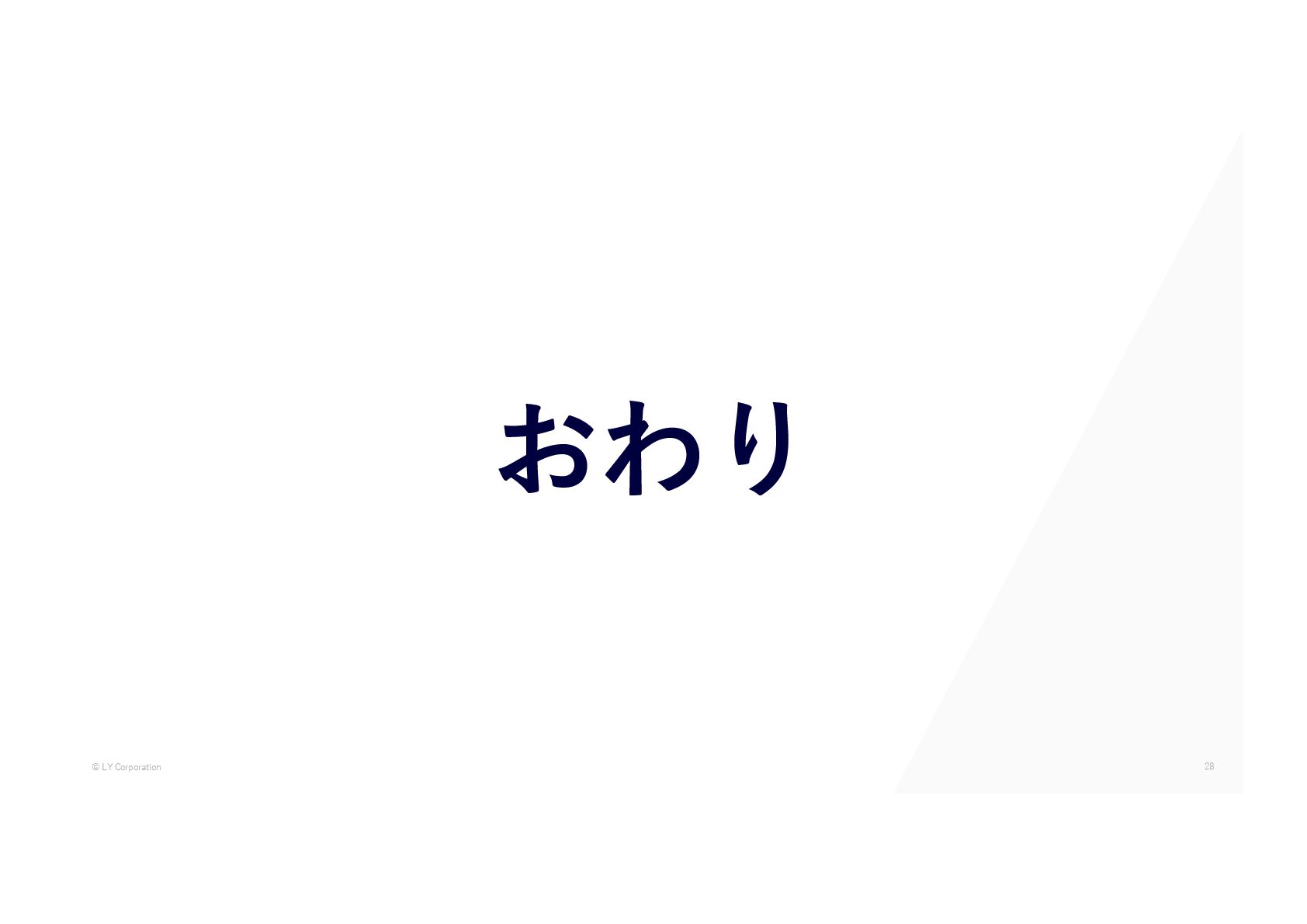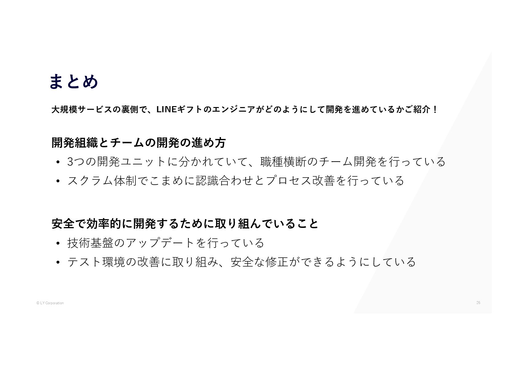 © LY Corporation 26 まとめ ⼤規模サービスの裏側で、LINEギフトのエンジニアがどのようにして開発を進めているかご紹介! 開発組織とチームの開発の進め⽅ 安全で効率的に開発するために取り組んでいること • 3つの開発ユニットに分かれていて、職種横断のチーム開発を⾏っている