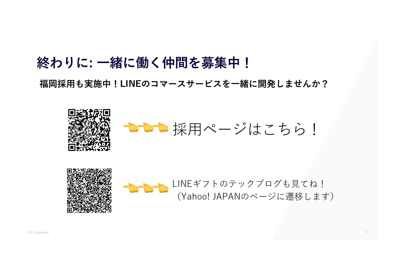 © LY Corporation 27 終わりに: ⼀緒に働く仲間を募集中! 👈👈👈 採⽤ページはこちら! 👈👈👈 LINEギフトのテックブログも⾒てね!