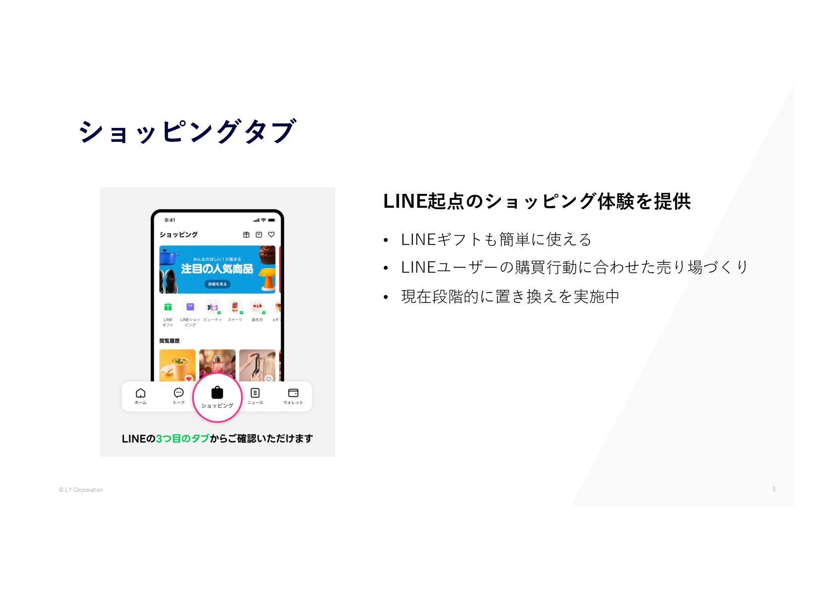 © LY Corporation ショッピングタブ 5 • LINEギフトも簡単に使える • LINEユーザーの購買⾏動に合わせた売り場づくり •