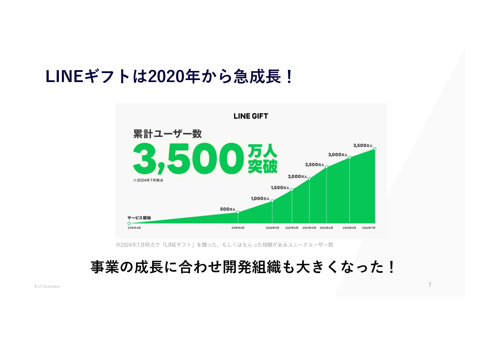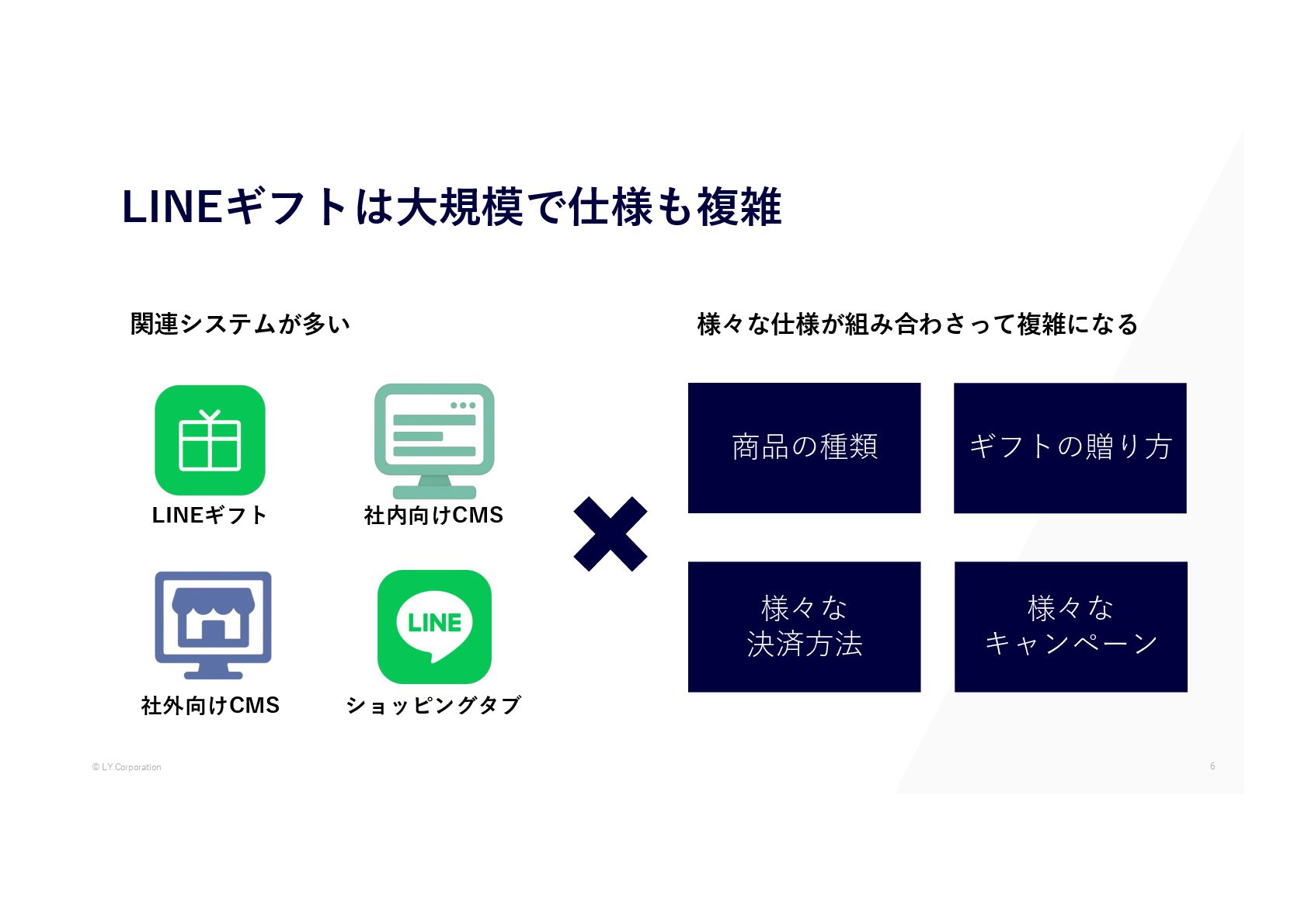 © LY Corporation 6 LINEギフトは⼤規模で仕様も複雑 商品の種類 ギフトの贈り⽅ 様々な キャンペーン 様々な