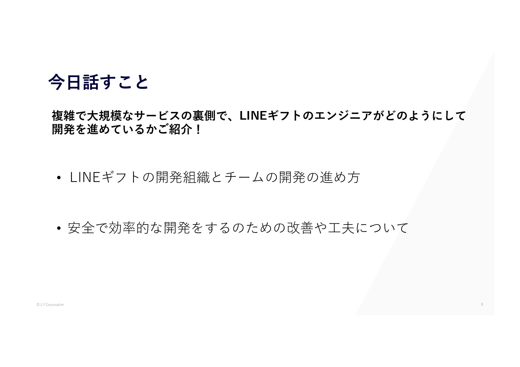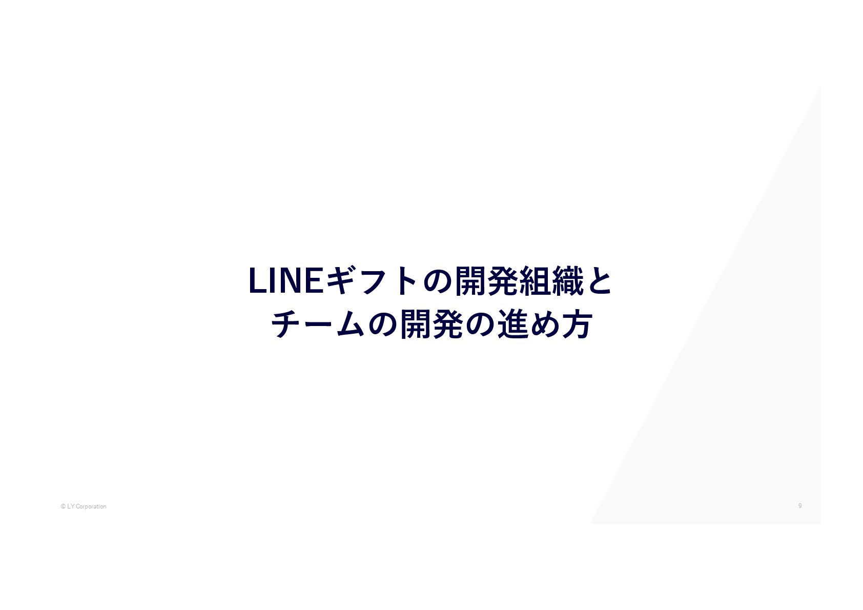 © LY Corporation 8 今⽇話すこと • LINEギフトの開発組織とチームの開発の進め⽅ 複雑で⼤規模なサービスの裏側で、LINEギフトのエンジニアがどのようにして 開発を進めているかご紹介! •