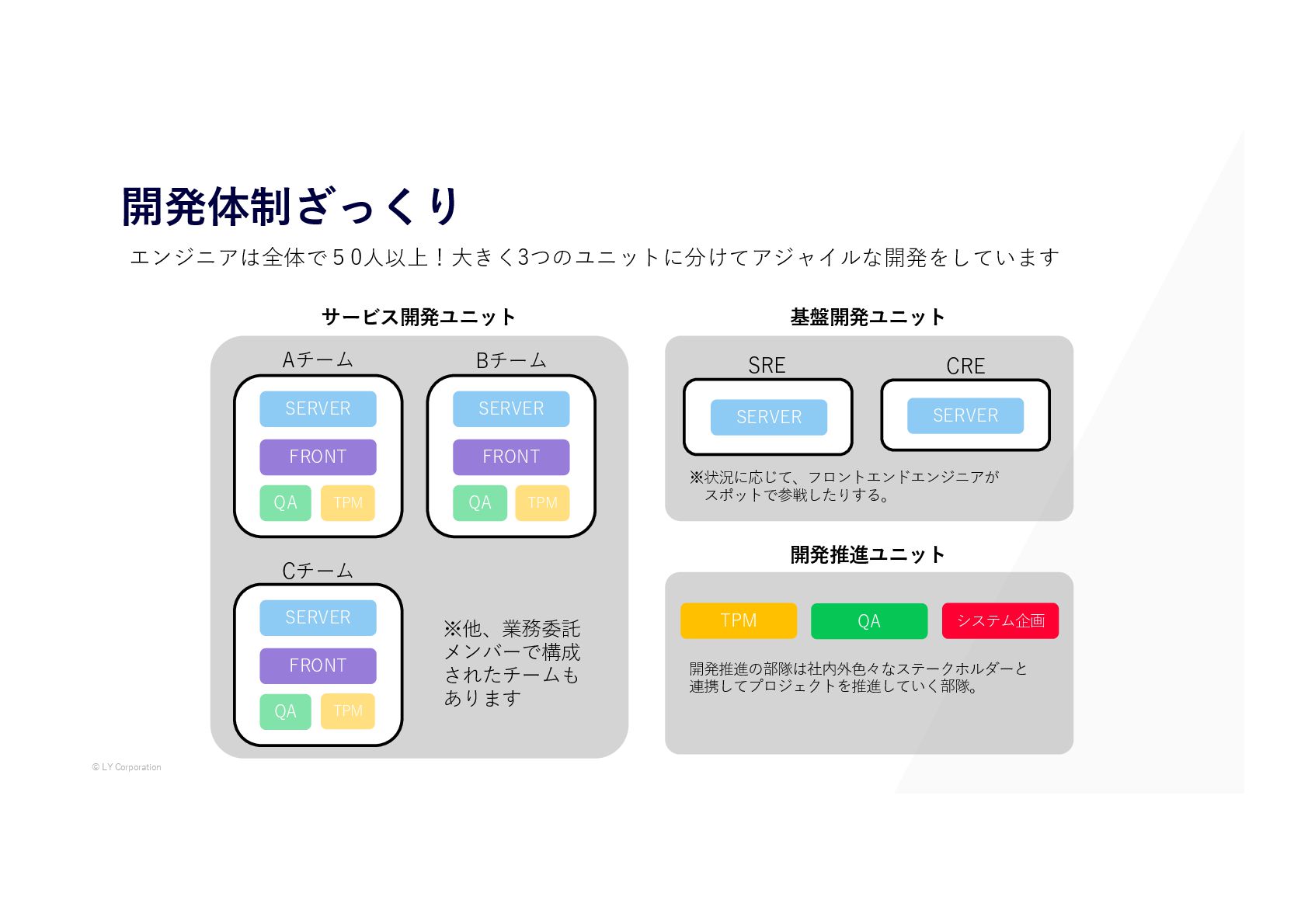 © LY Corporation 開発体制ざっくり サービス開発ユニット 基盤開発ユニット 開発推進ユニット SERVER FRONT QA