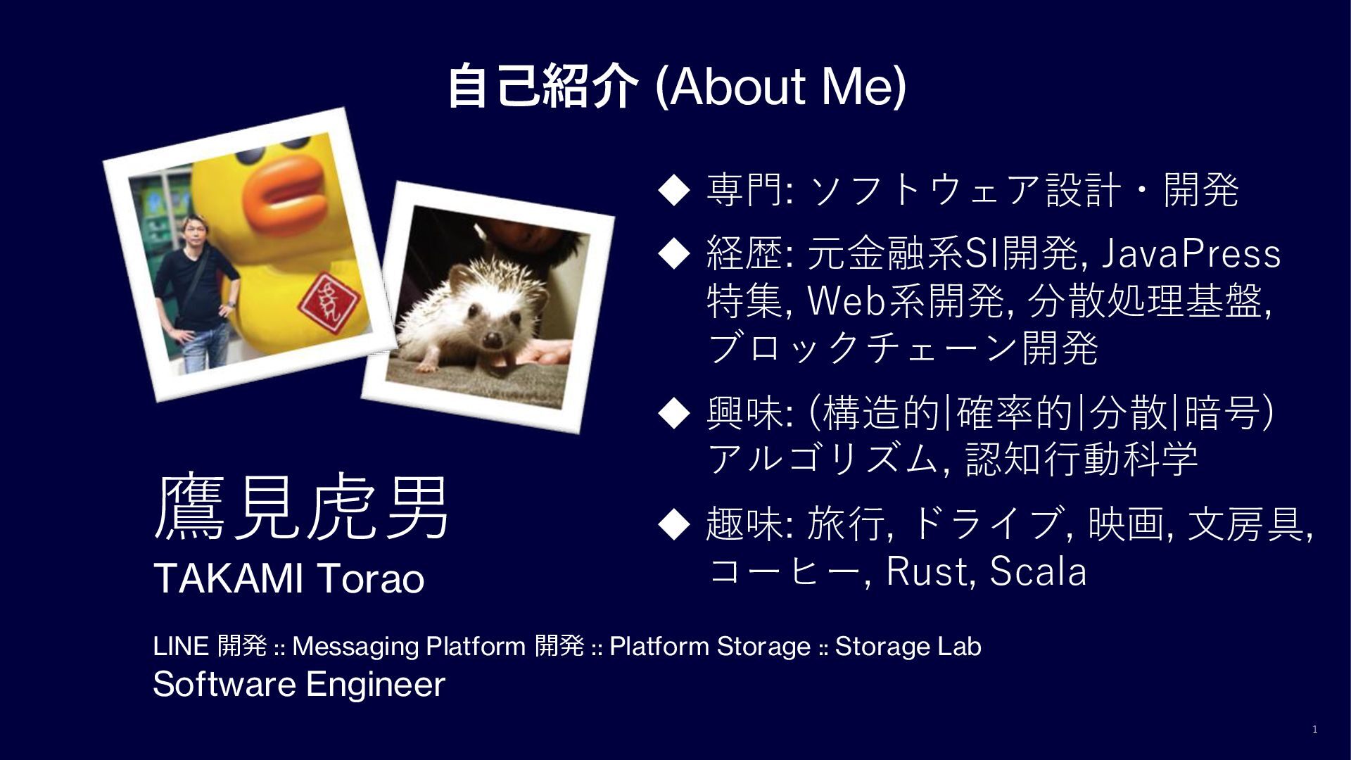 Messaging Platform 開発 :: Platform Storage :: Storage Lab Software Engineer ◆ 専門: ソフトウェア設計・開発 ◆ 経歴: 元金融系SI開発, JavaPress 特集, Web系開発, 分散処理基盤, ブロックチェーン開発 ◆ 興味: (構造的|確率的|分散|暗号) アルゴリズム, 認知行動科学 ◆ 趣味: 旅行, ドライブ, 映画, 文房具, コーヒー, Rust, Scala