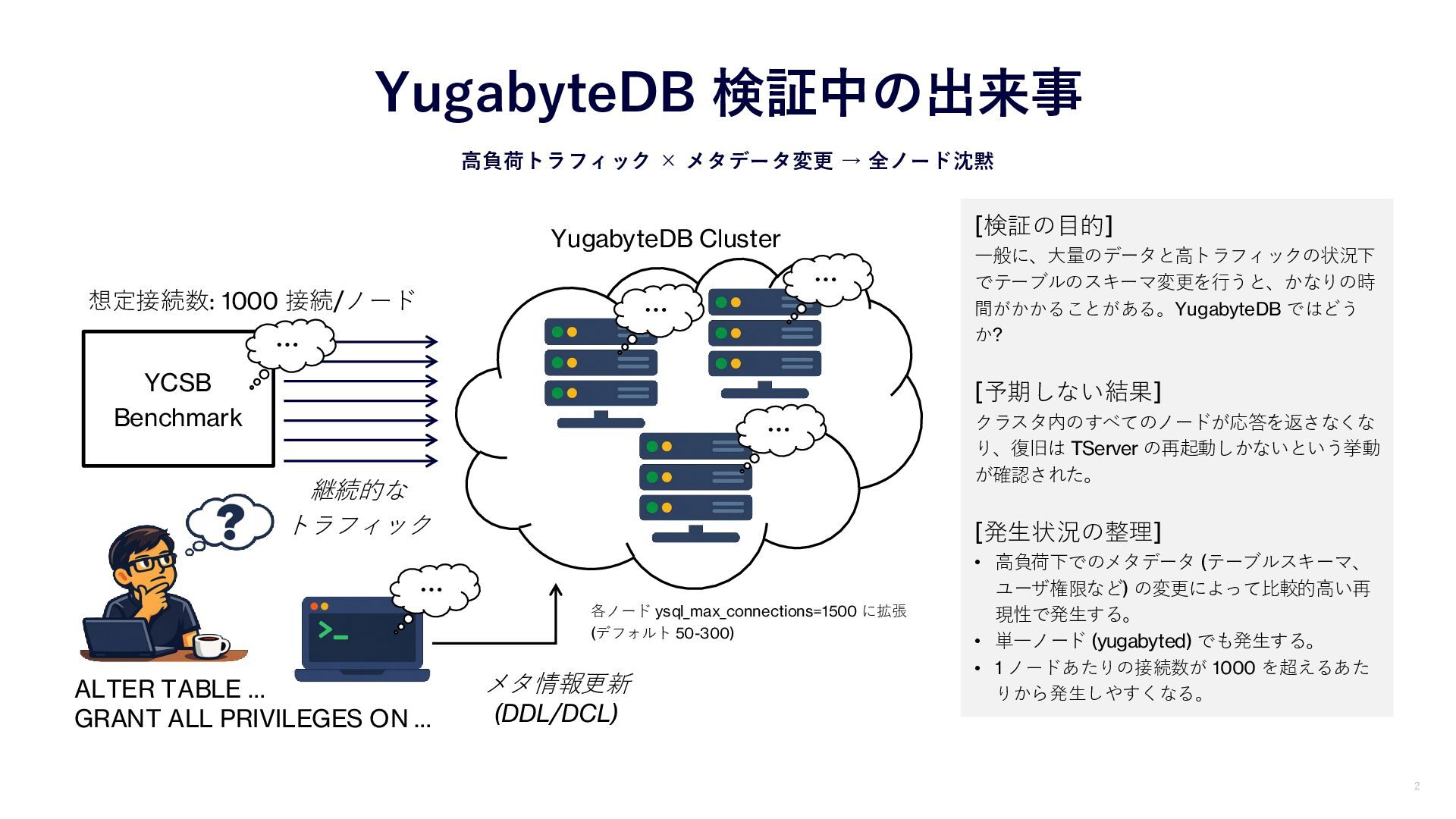 YugabyteDB 検証中の出来事 高負荷トラフィック × メタデータ変更 → 全ノード沈黙 YCSB Benchmark 2 各ノード ysql_max_connections=1500 に拡張 (デフォルト 50-300) 想定接続数: 1000 接続/ノード [検証の目的] 一般に、大量のデータと高トラフィックの状況下 でテーブルのスキーマ変更を行うと、かなりの時 間がかかることがある。YugabyteDB ではどう か? [予期しない結果] クラスタ内のすべてのノードが応答を返さなくな り、復旧は TServer の再起動しかないという挙動 が確認された。 [発生状況の整理] • 高負荷下でのメタデータ (テーブルスキーマ、 ユーザ権限など) の変更によって比較的高い再 現性で発生する。 • 単一ノード (yugabyted) でも発生する。 • 1 ノードあたりの接続数が 1000 を超えるあた りから発生しやすくなる。 継続的な トラフィック YugabyteDB Cluster … … … … …