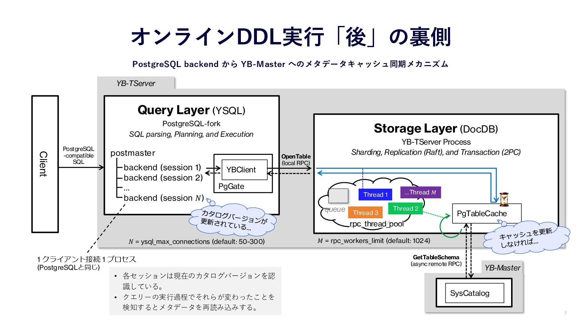 YB-Master YB-TServer オンラインDDL実行「後」の裏側 PostgreSQL backend から YB-Master へのメタデータキャッシュ同期メカニズム Client Query