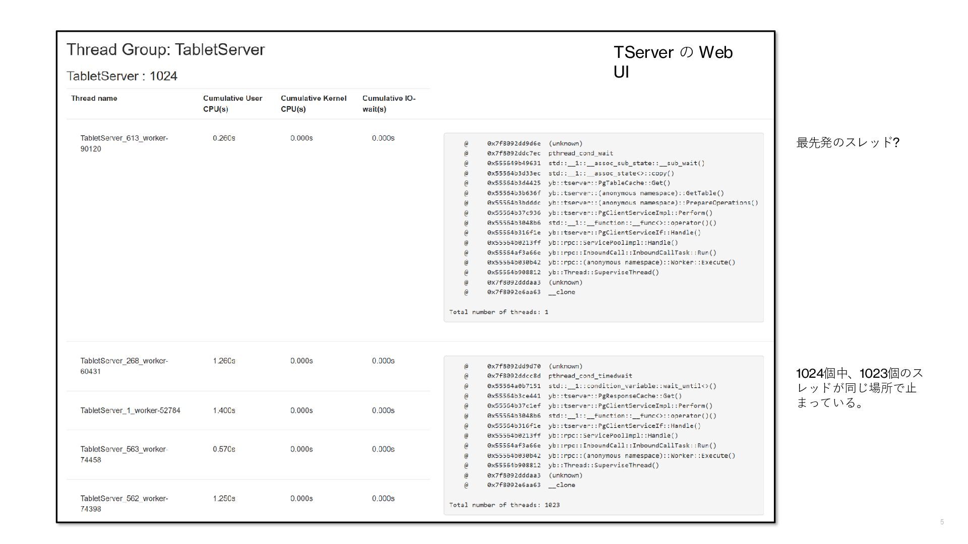 5 1024個中、1023個のス レッドが同じ場所で止 まっている。 TServer の Web UI 最先発のスレッド?