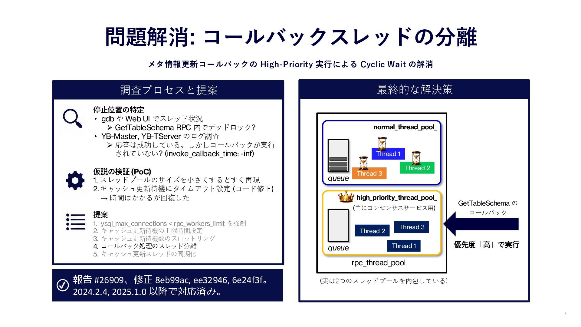 の解消 6 rpc_thread_pool Thread 2 Thread 1 Thread 3 queue high_priority_thread_pool_ Thread 2 Thread 1 Thread 3 queue (主にコンセンサスサービス用) 停止位置の特定 • gdb や Web UI でスレッド状況 ➢ GetTableSchema RPC 内でデッドロック? • YB-Master, YB-TServer のログ調査 ➢ 応答は成功している。しかしコールバックが実行 されていない? (invoke_callback_time: -inf) 仮説の検証 (PoC) 1. スレッドプールのサイズを小さくするとすぐ再現 2.キャッシュ更新待機にタイムアウト設定 (コード修正) → 時間はかかるが回復した 提案 1. ysql_max_connections < rpc_workers_limit を強制 2. キャッシュ更新待機の上限時間設定 3. キャッシュ更新待機数のスロットリング 4. コールバック処理のスレッド分離 5. キャッシュ更新スレッドの同期化 報告 #26909、修正 8eb99ac, ee32946, 6e24f3f。 2024.2.4, 2025.1.0 以降で対応済み。 GetTableSchema の コールバック 優先度「高」で実行 (実は2つのスレッドプールを内包している)