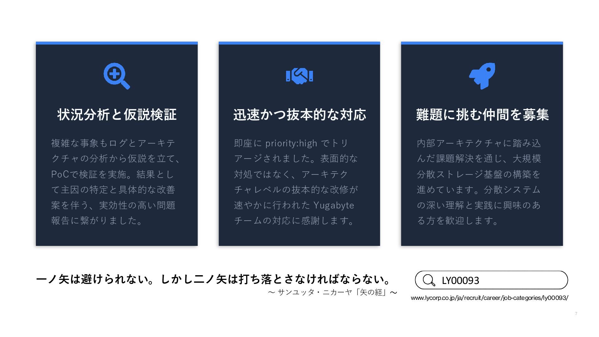 priority:high でトリ アージされました。表面的な 対処ではなく、アーキテク チャレベルの抜本的な改修が 速やかに行われた Yugabyte チームの対応に感謝します。 難題に挑む仲間を募集 内部アーキテクチャに踏み込 んだ課題解決を通じ、大規模 分散ストレージ基盤の構築を 進めています。分散システム の深い理解と実践に興味のあ る方を歓迎します。 一ノ矢は避けられない。しかし二ノ矢は打ち落とさなければならない。 ~ サンユッタ・ニカーヤ「矢の経」~ LY00093 www.lycorp.co.jp/ja/recruit/career/job-categories/ly00093/