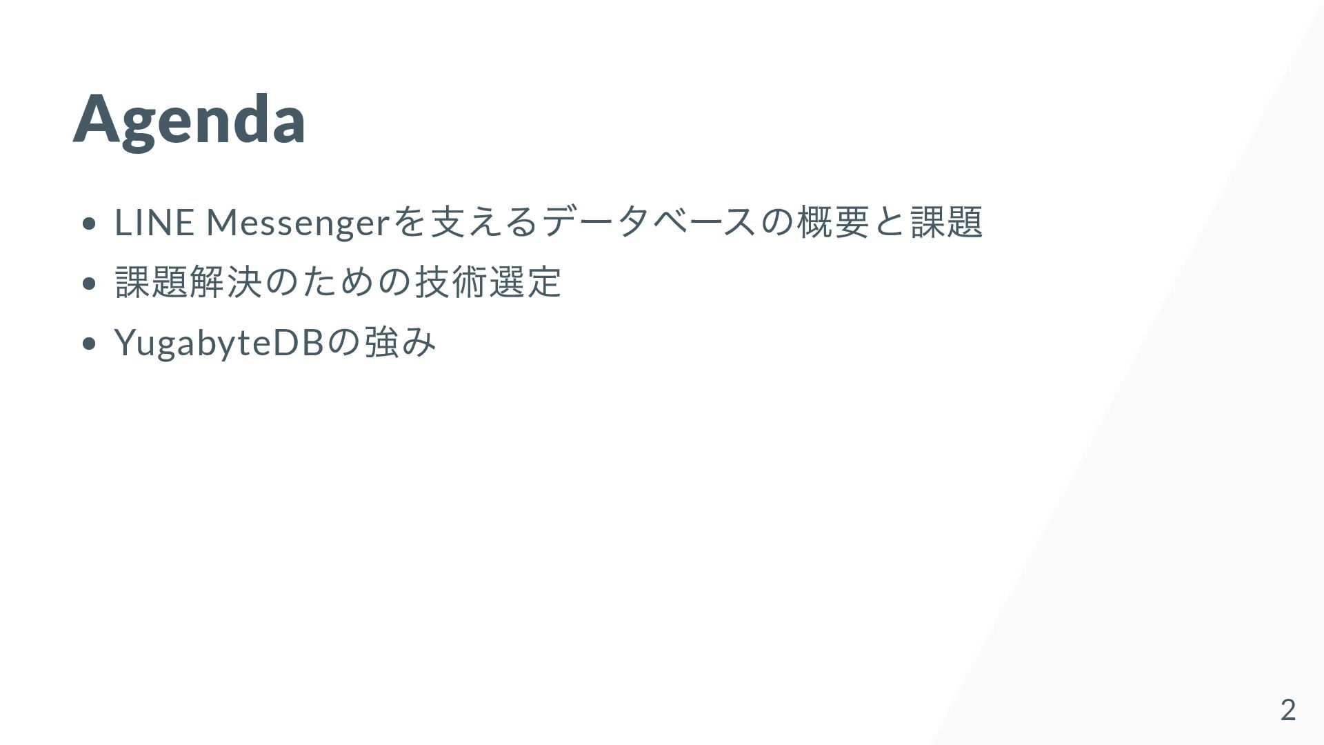 Agenda LINE Messenger を支えるデータベースの概要と課題 課題解決のための技術選定 YugabyteDB の強み 2