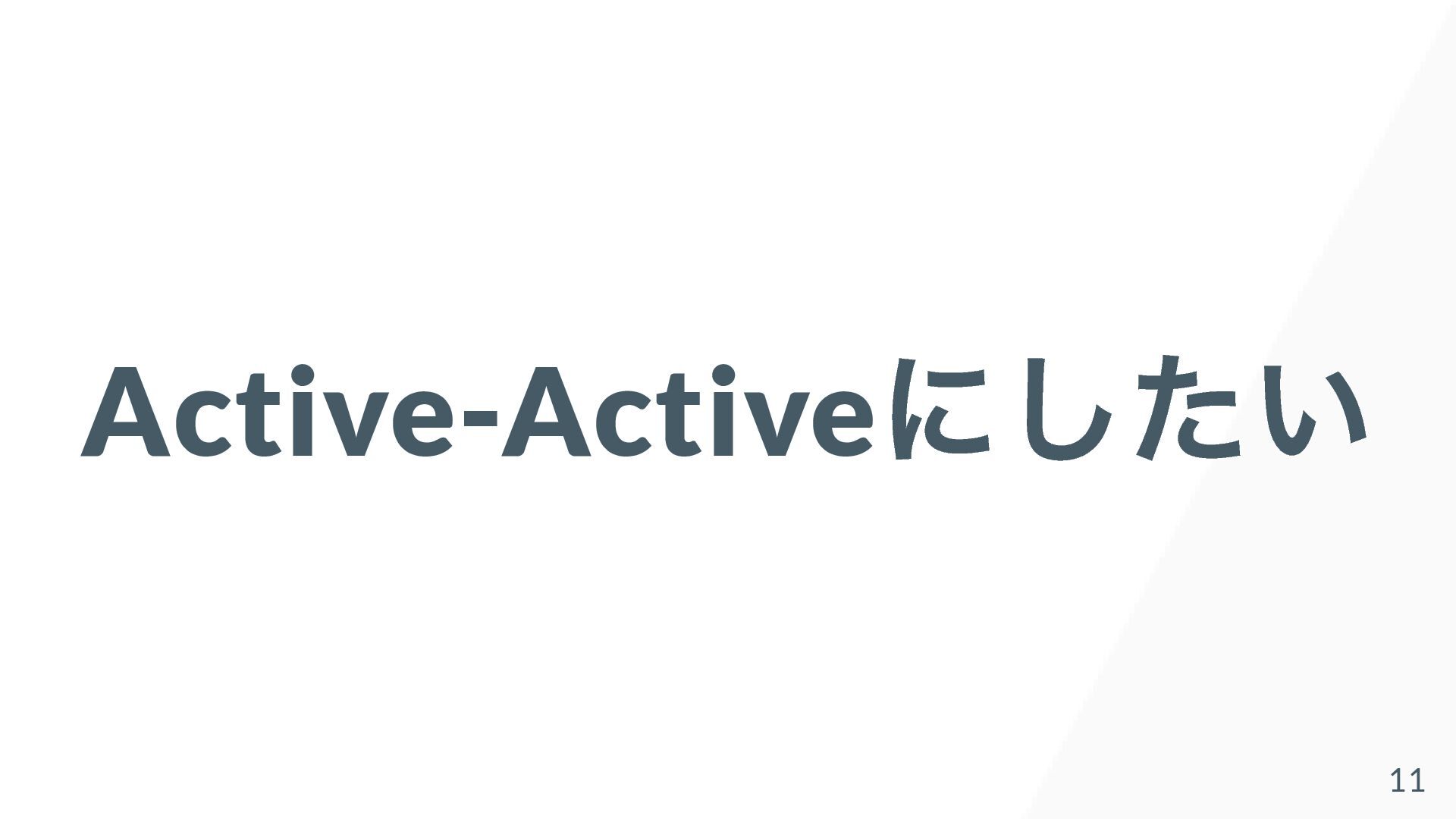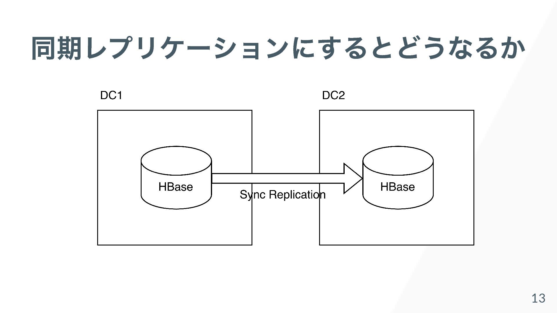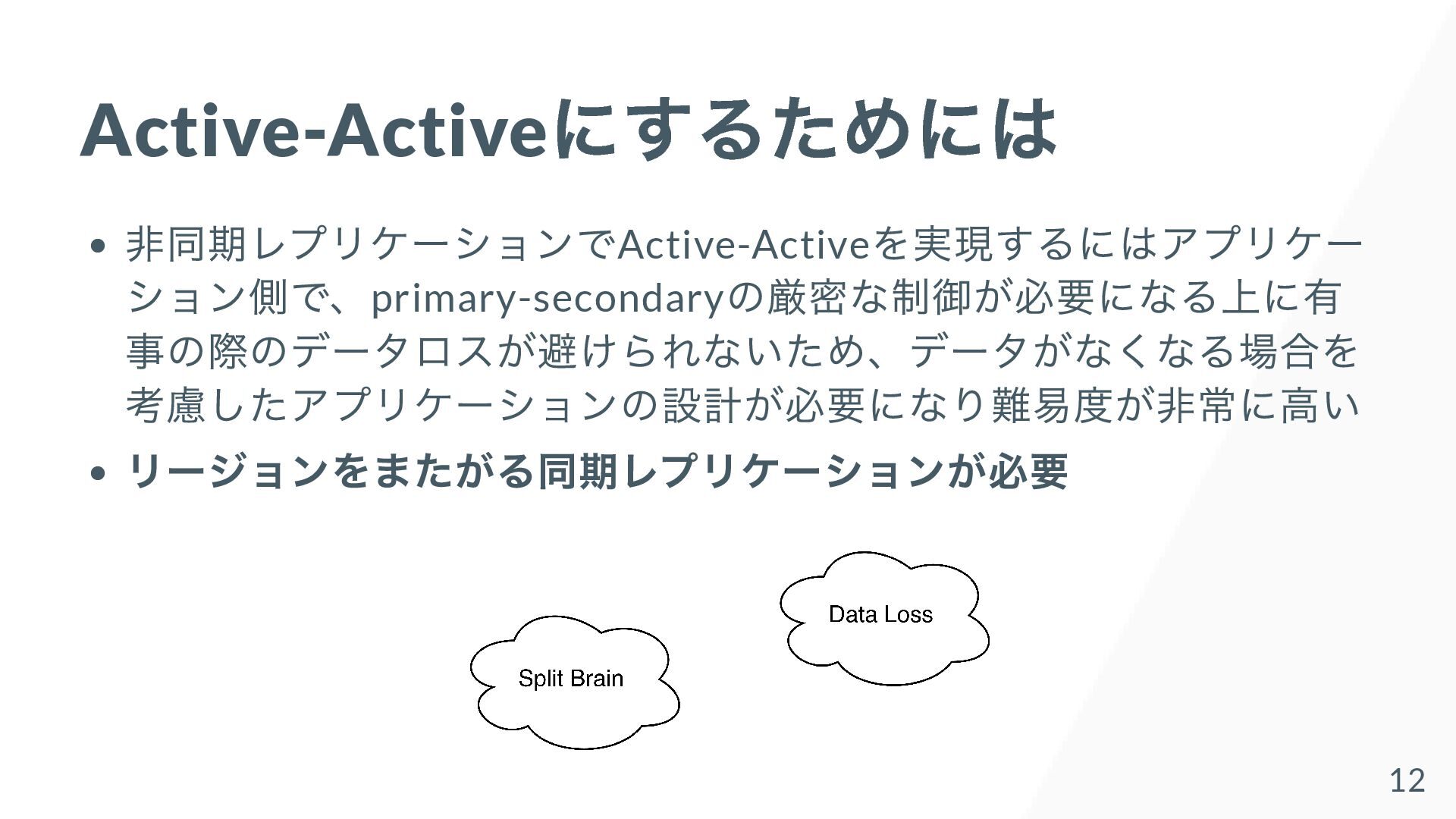 Active-Active にするためには 非同期レプリケーションでActive-Active を実現するにはアプリケー ション側で、primary-secondary の厳密な制御が必要になる上に有 事の際のデータロスが避けられないため、データがなくなる場合を 考慮したアプリケーションの設計が必要になり難易度が非常に高い リージョンをまたがる同期レプリケーションが必要 12