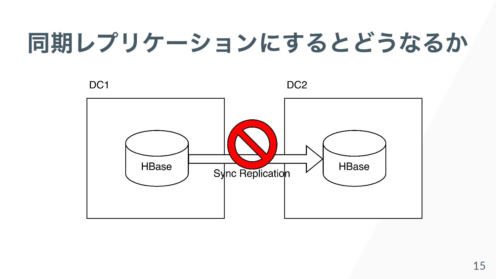 HBase のレプリケーション 内部的にはHDFS レイヤーでのチェイ ンレプリケーション 複数地域にまたがる場合は可用性を 考慮すると使えない クラスタ間のレプリケーションは非 同期のみサポート Destination