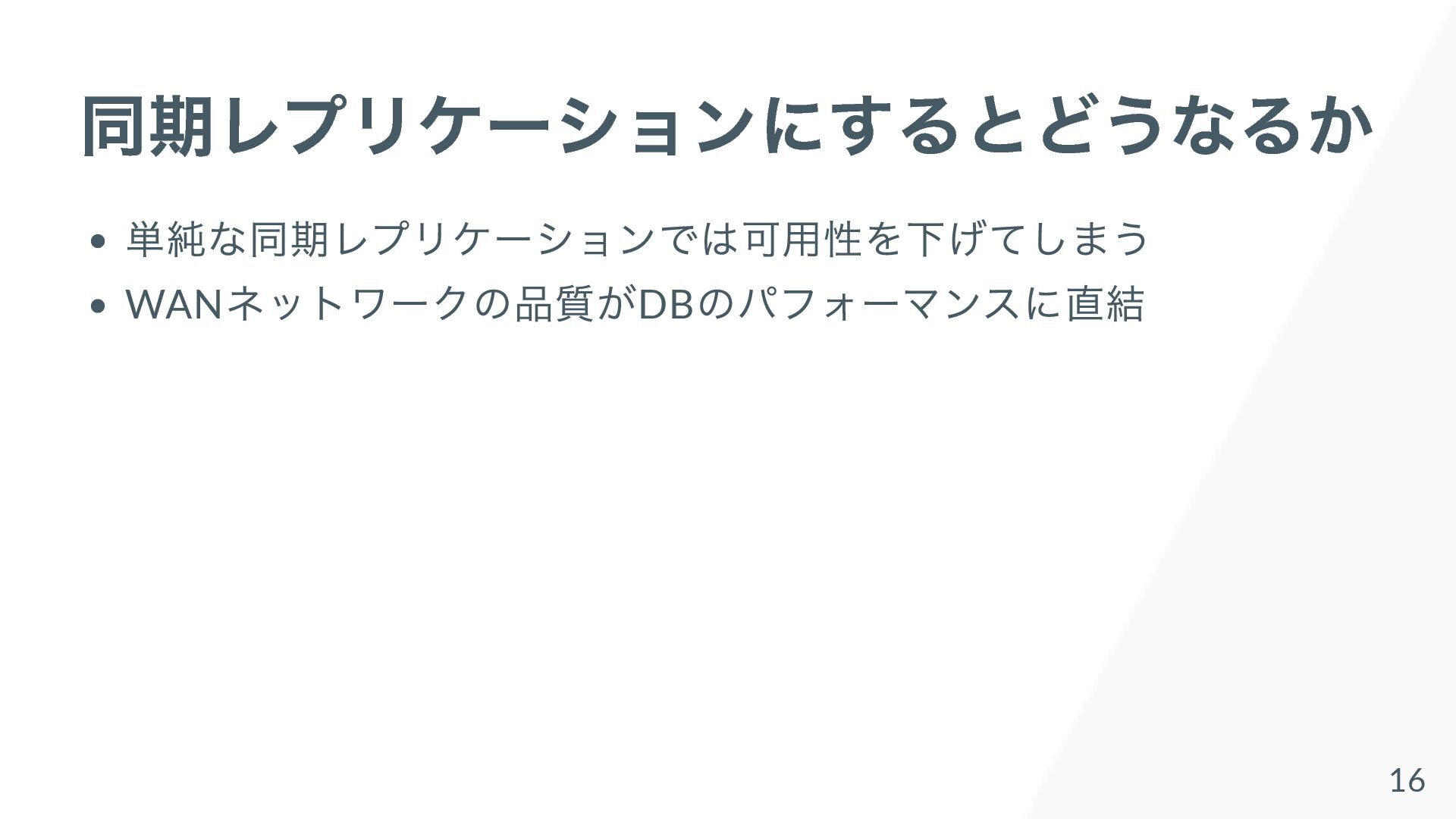 同期レプリケーションにするとどうなるか 単純な同期レプリケーションでは可用性を下げてしまう WAN ネットワークの品質がDB のパフォーマンスに直結 16