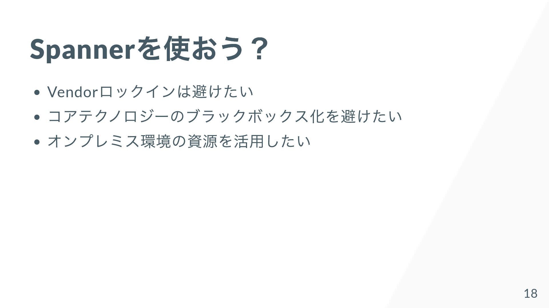Spanner を使おう? Vendor ロックインは避けたい コアテクノロジーのブラックボックス化を避けたい オンプレミス環境の資源を活用したい 18