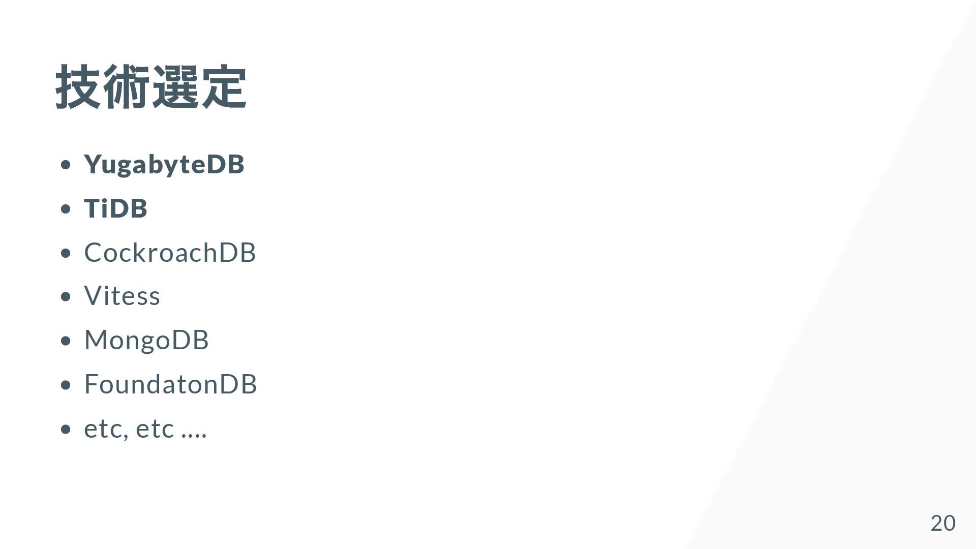 技術選定 YugabyteDB TiDB CockroachDB Vitess MongoDB FoundatonDB etc, etc ....