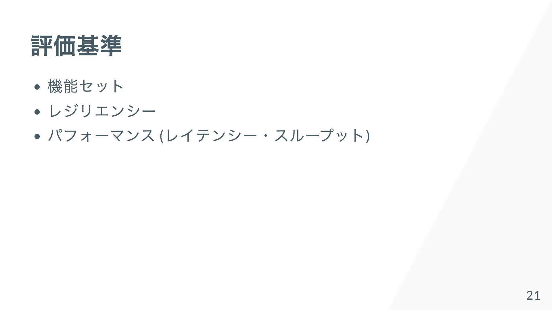 評価基準 機能セット レジリエンシー パフォーマンス ( レイテンシー・スループット) 21