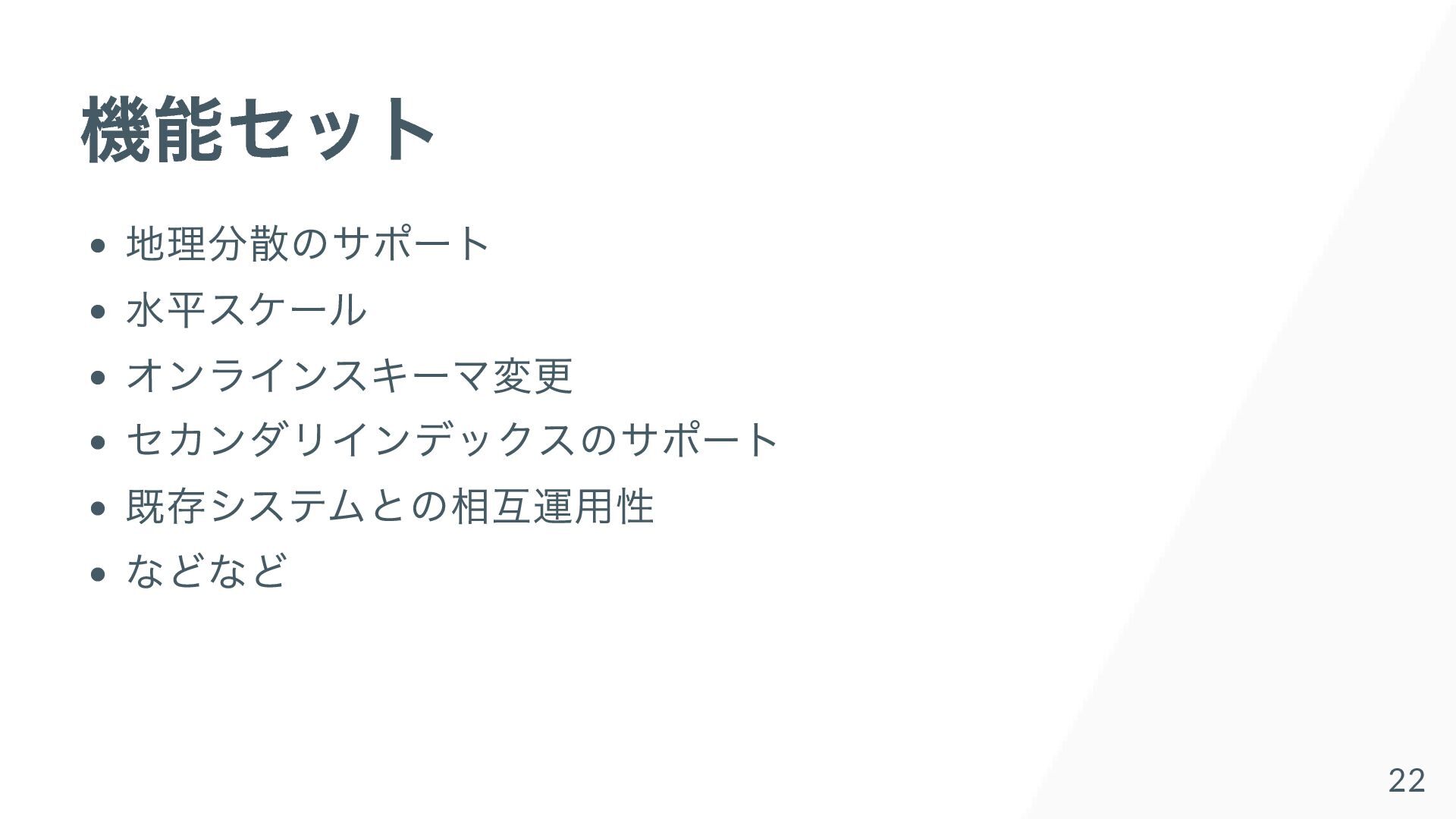 機能セット 地理分散のサポート 水平スケール オンラインスキーマ変更 セカンダリインデックスのサポート 既存システムとの相互運用性 などなど 22