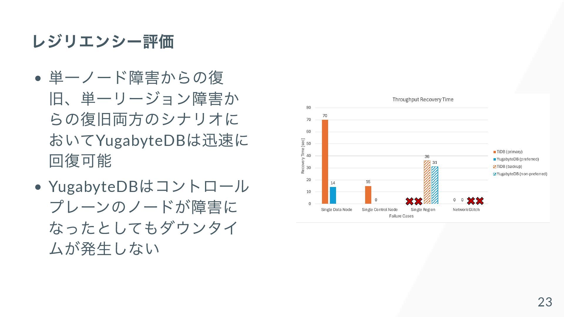 レジリエンシー評価 単一ノード障害からの復 旧、単一リージョン障害か らの復旧両方のシナリオに おいてYugabyteDB は迅速に 回復可能 YugabyteDB はコントロール プレーンのノードが障害に