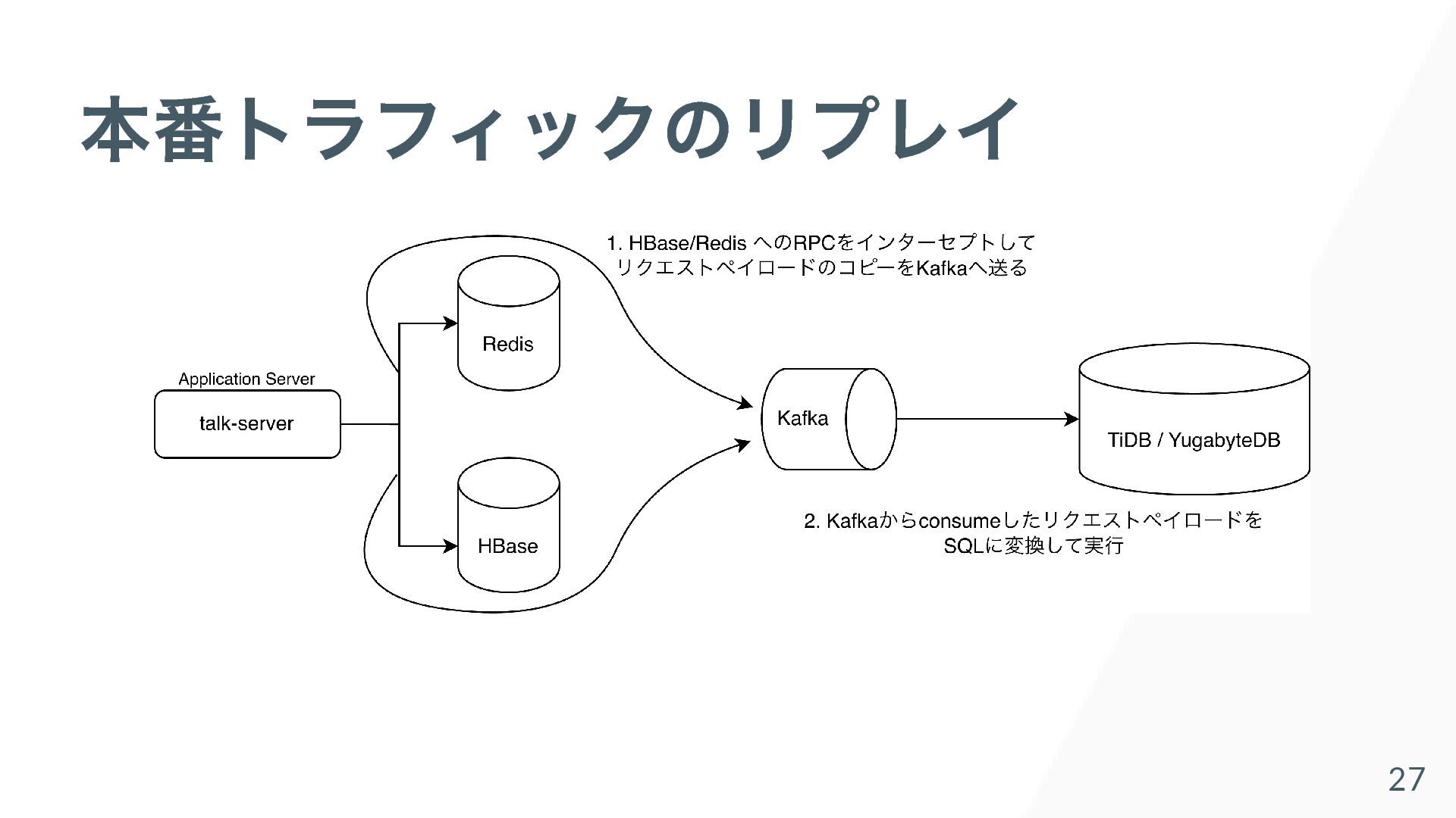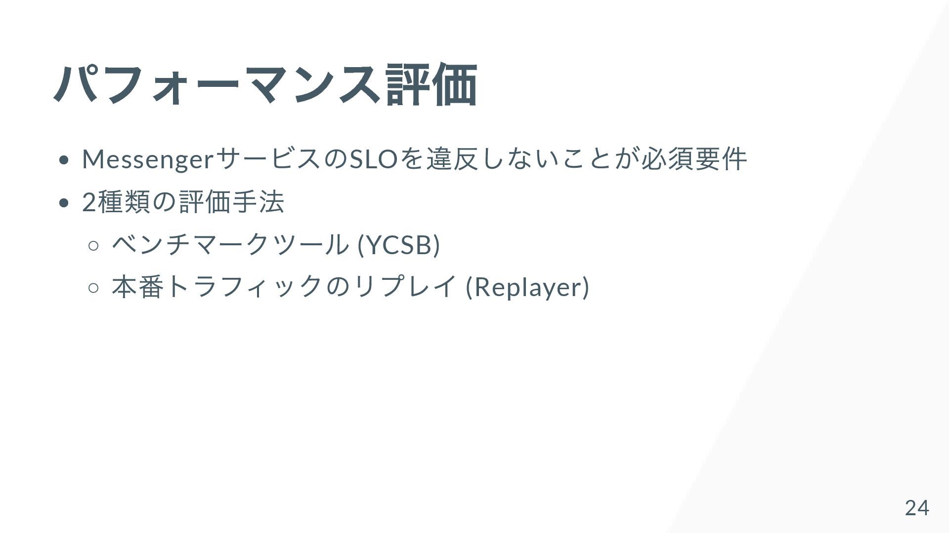 パフォーマンス評価 Messenger サービスのSLO を違反しないことが必須要件 2 種類の評価手法 ベンチマークツール (YCSB) 本番トラフィックのリプレイ (Replayer)