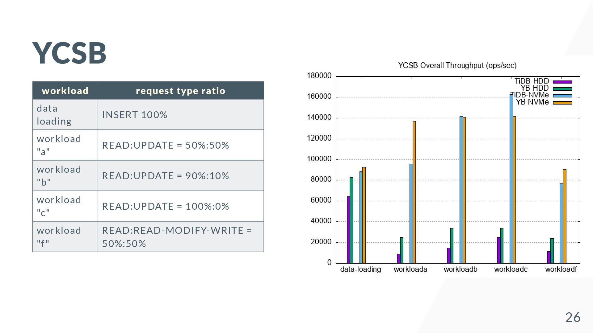 "a" READ:UPDATE = 50%:50% workload "b" READ:UPDATE = 90%:10% workload "c" READ:UPDATE = 100%:0% workload "f" READ:READ-MODIFY-WRITE = 50%:50% 26