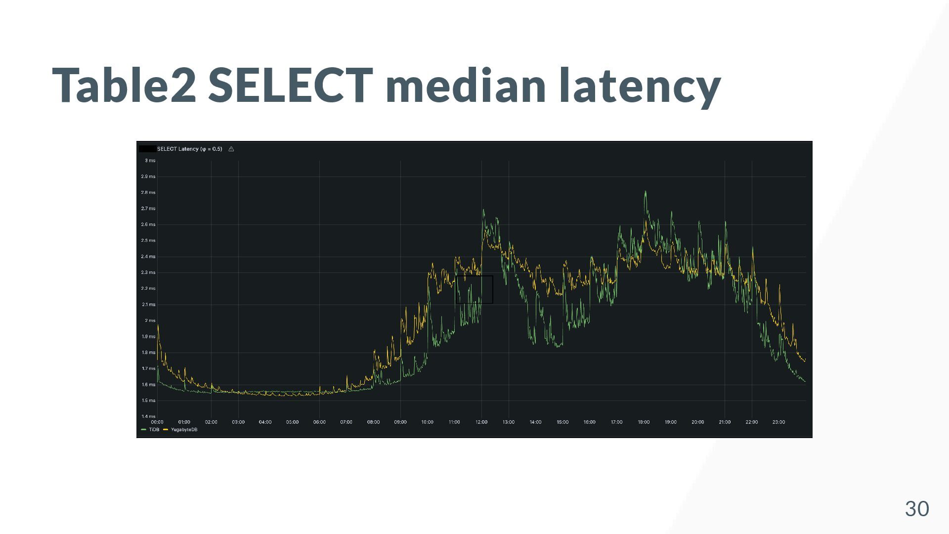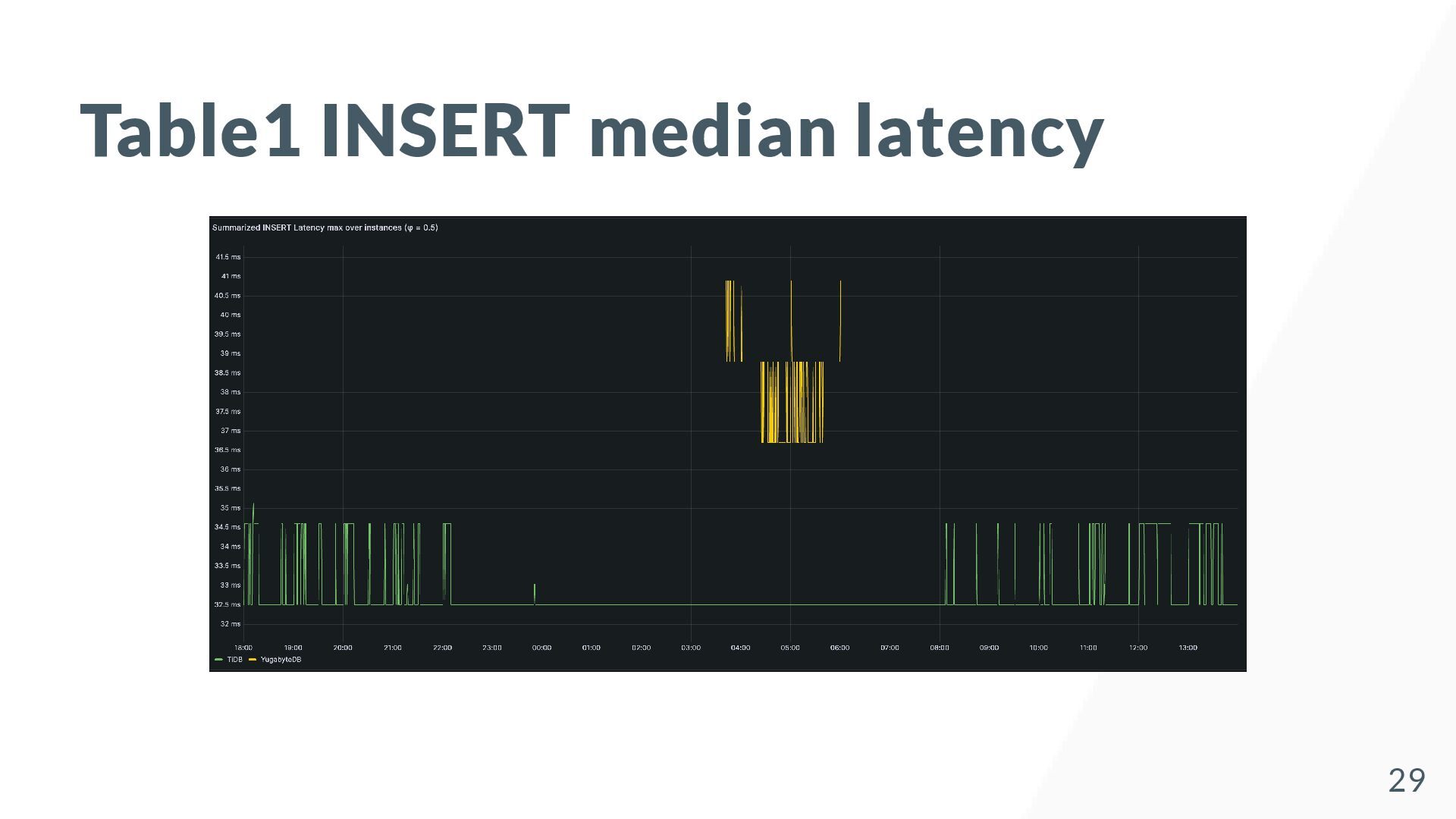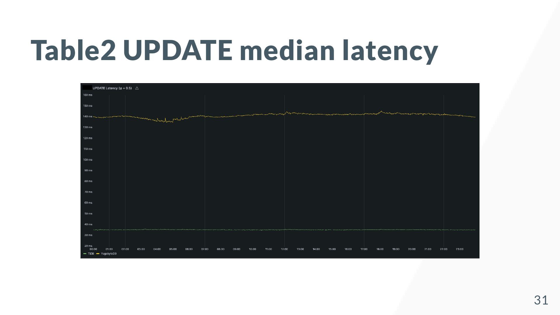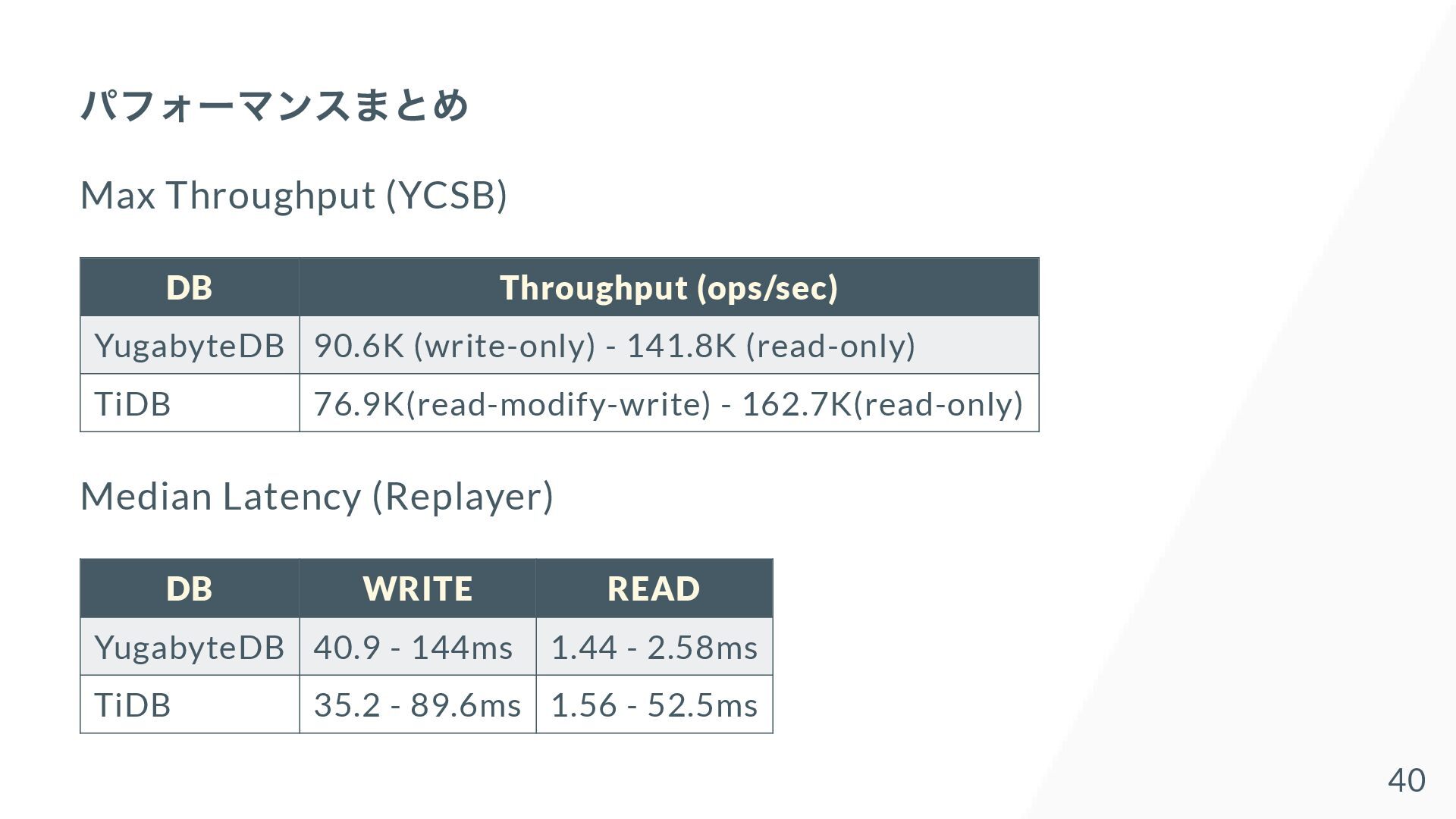 - 141.8K (read-only) TiDB 76.9K(read-modify-write) - 162.7K(read-only) Median Latency (Replayer) DB WRITE READ YugabyteDB 40.9 - 144ms 1.44 - 2.58ms TiDB 35.2 - 89.6ms 1.56 - 52.5ms 40