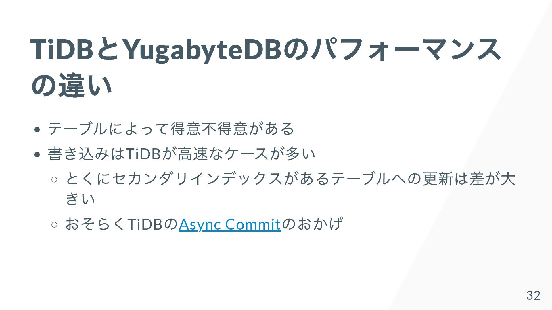 TiDB とYugabyteDB のパフォーマンス の違い テーブルによって得意不得意がある 書き込みはTiDB が高速なケースが多い とくにセカンダリインデックスがあるテーブルへの更新は差が大 きい おそらくTiDB
