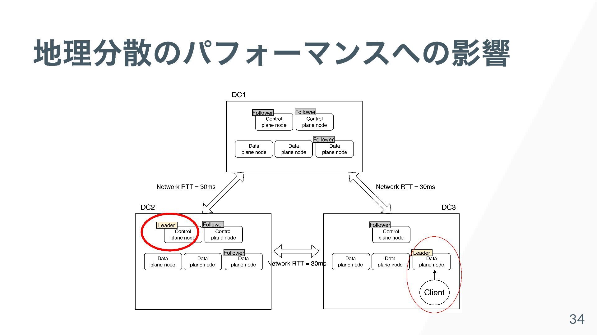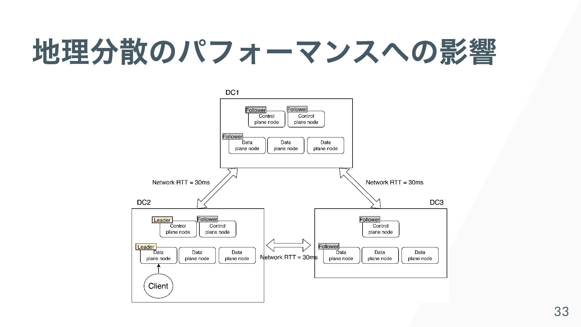 トランザクションの順序付けの実装 TiDB: TimeStamp Oracle 方式を採用 ほぼすべてのトランザクションがPD Leader にアクセスする必要 があるため地理分散環境ではボトルネックが生じる YugabyteDB: