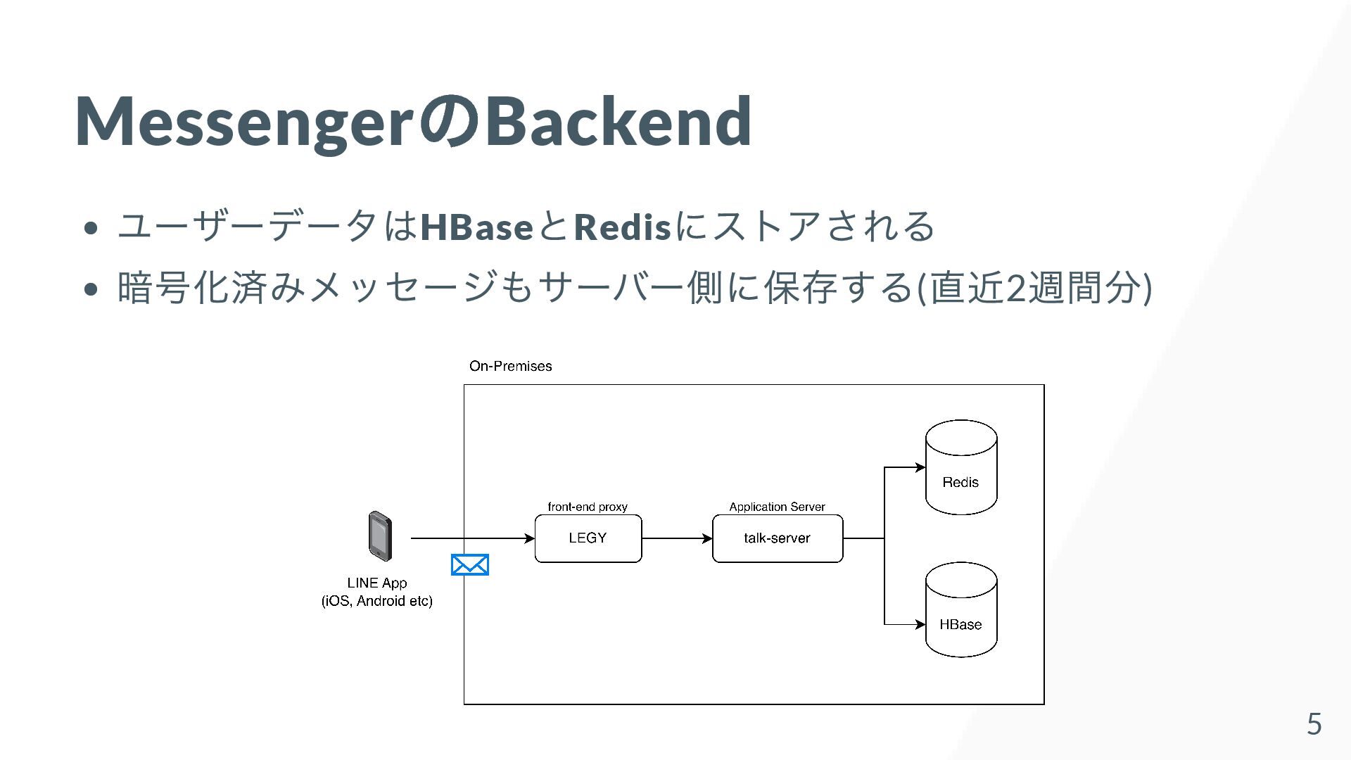Messenger のBackend ユーザーデータはHBase とRedis にストアされる 暗号化済みメッセージもサーバー側に保存する( 直近2 週間分) 5