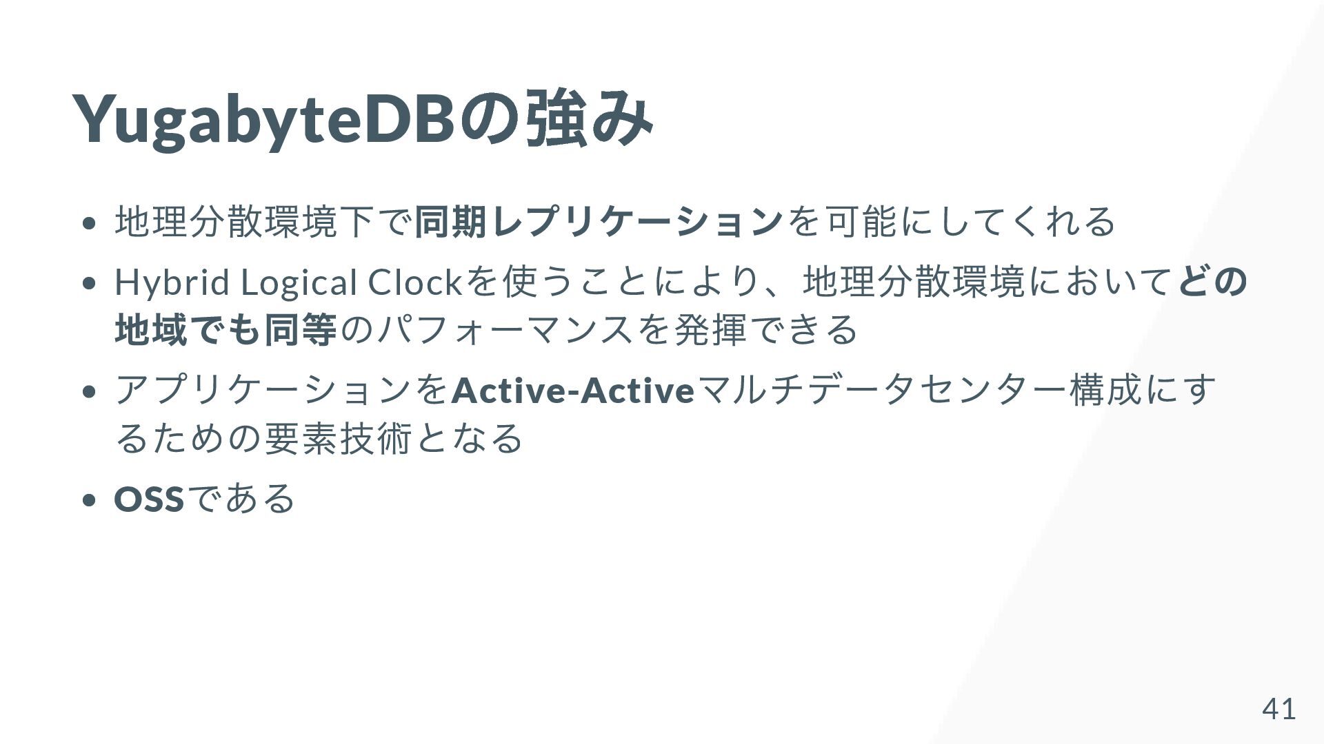 YugabyteDB の強み 地理分散環境下で同期レプリケーションを可能にしてくれる Hybrid Logical Clock を使うことにより、地理分散環境においてどの 地域でも同等のパフォーマンスを発揮できる アプリケーションをActive-Active マルチデータセンター構成にす