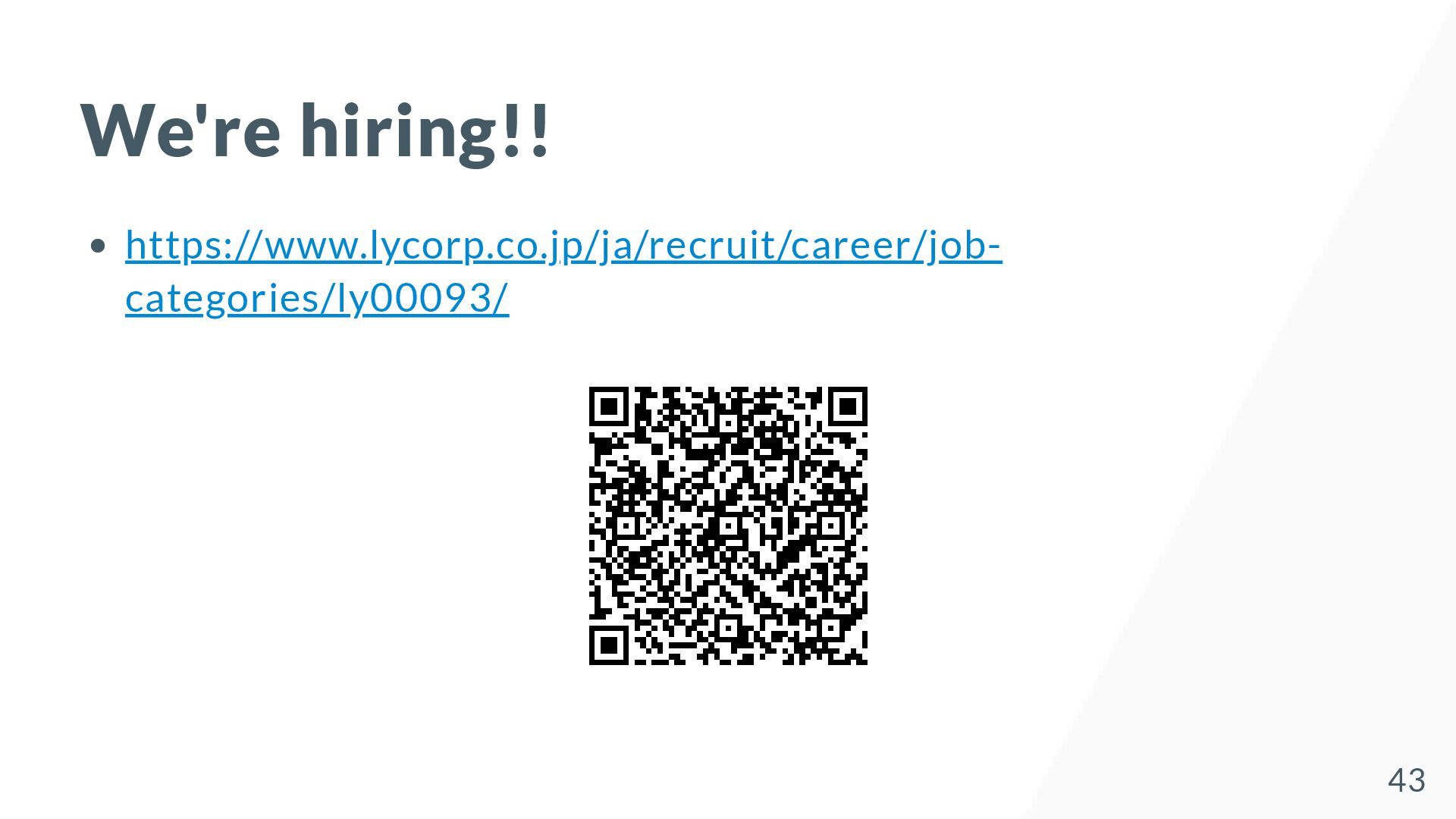 We're hiring!! https://www.lycorp.co.jp/ja/recruit/career/job- categories/ly00093/ 43
