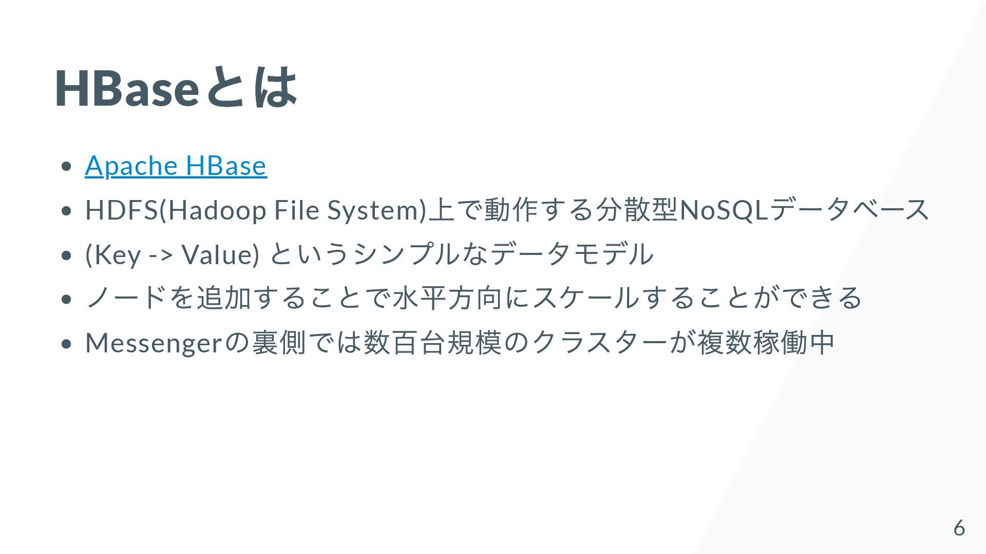 HBase とは Apache HBase HDFS(Hadoop File System) 上で動作する分散型NoSQL データベース (Key