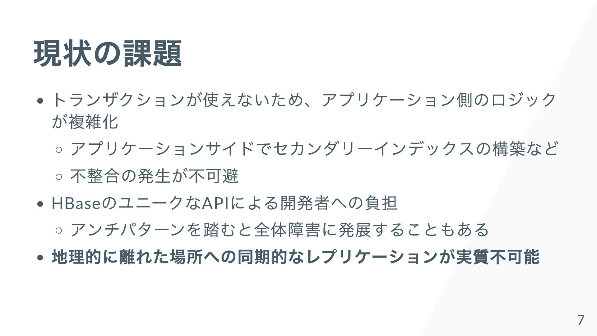 現状の課題 トランザクションが使えないため、アプリケーション側のロジック が複雑化 アプリケーションサイドでセカンダリーインデックスの構築など 不整合の発生が不可避 HBase のユニークなAPI による開発者への負担 アンチパターンを踏むと全体障害に発展することもある 地理的に離れた場所への同期的なレプリケーションが実質不可能