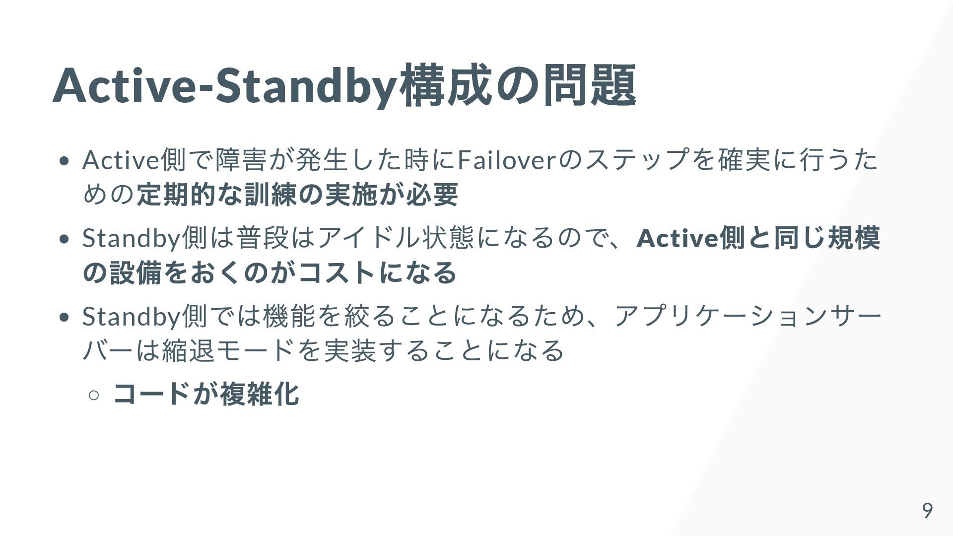 Active-Standby 構成の問題 Active 側で障害が発生した時にFailover のステップを確実に行うた めの定期的な訓練の実施が必要 Standby 側は普段はアイドル状態になるので、Active 側と同じ規模 の設備をおくのがコストになる