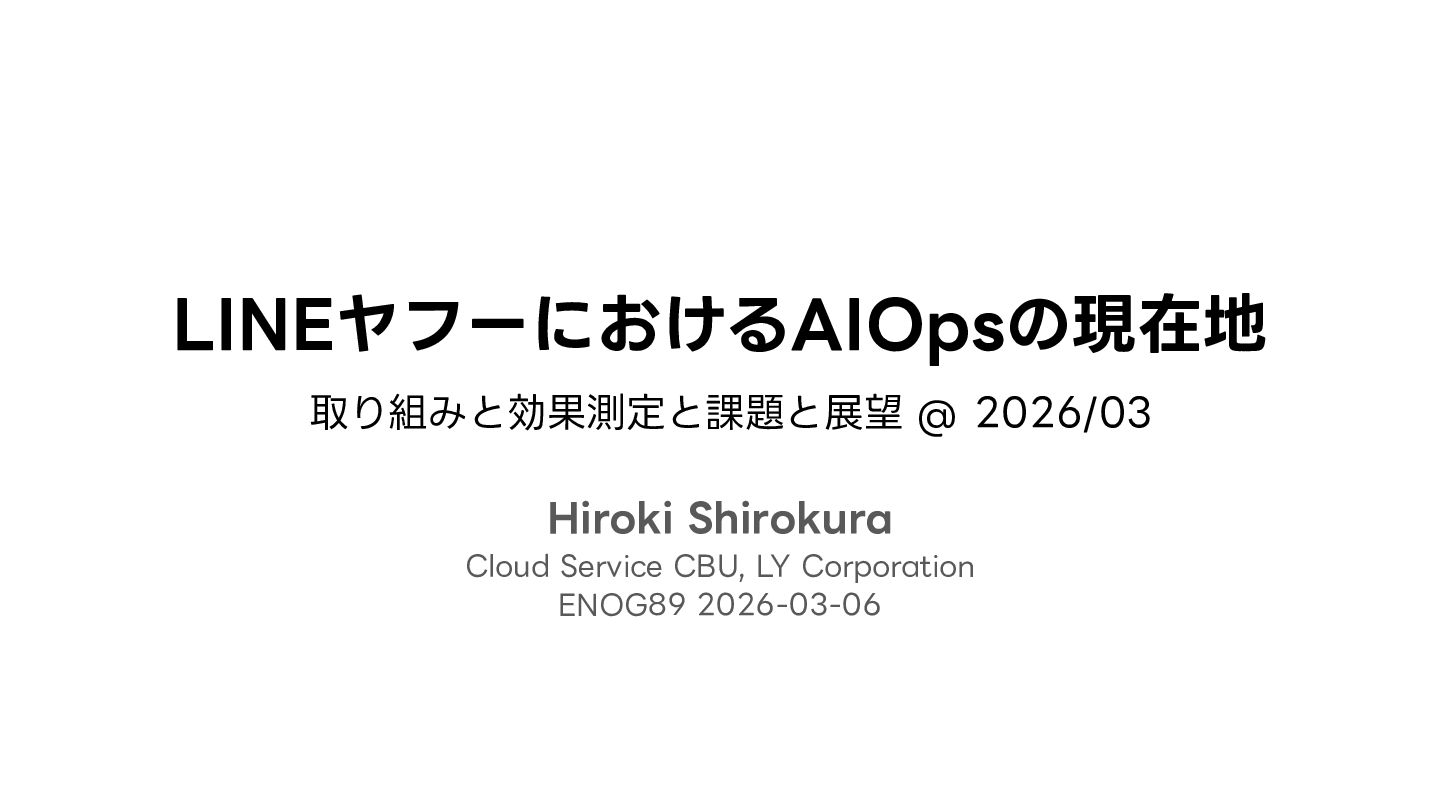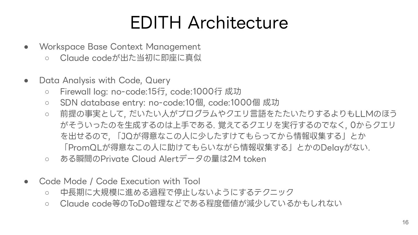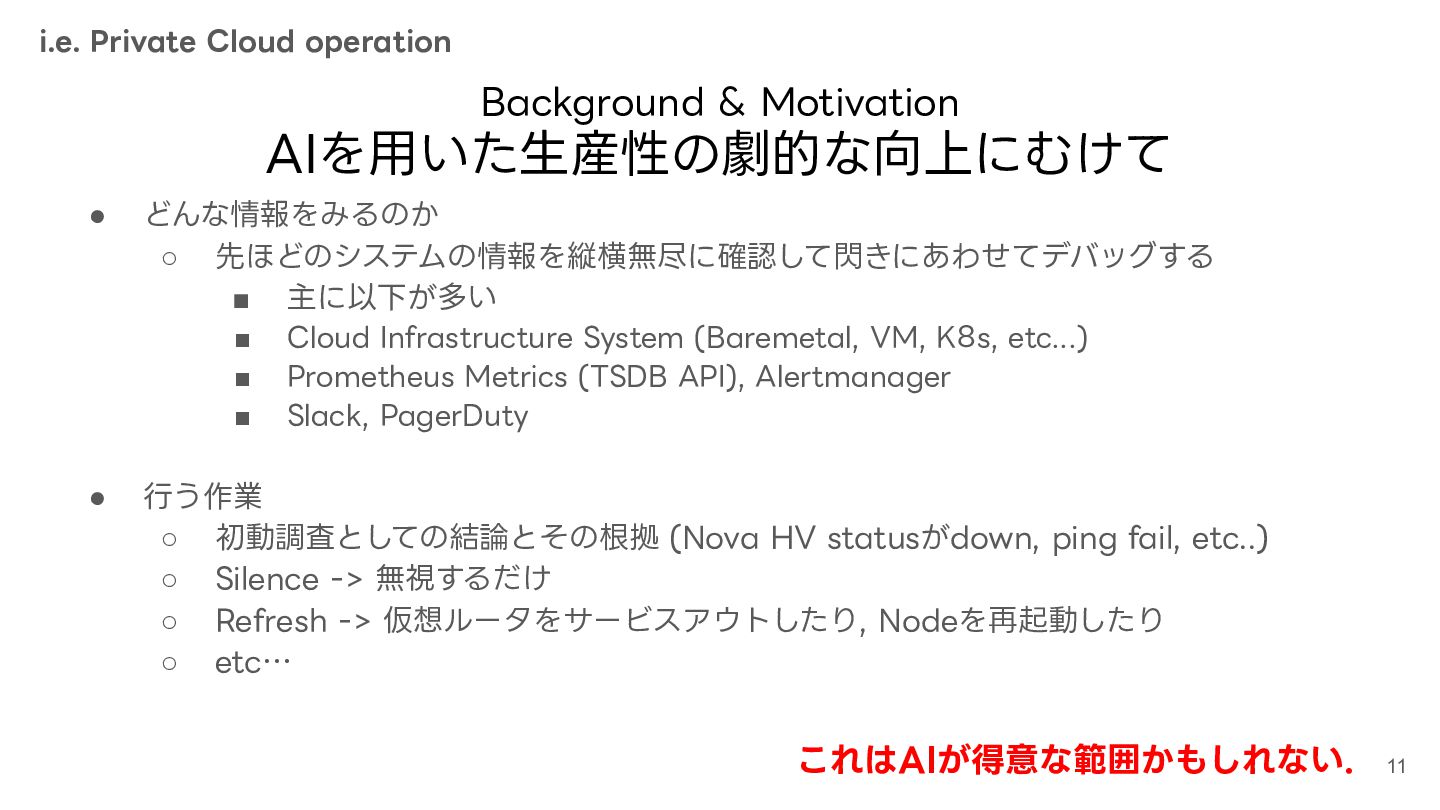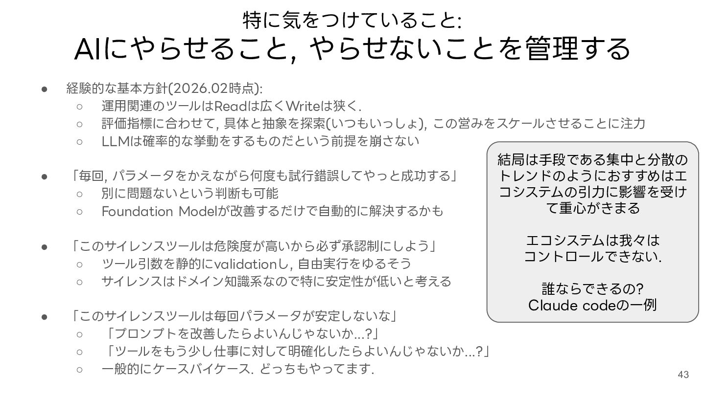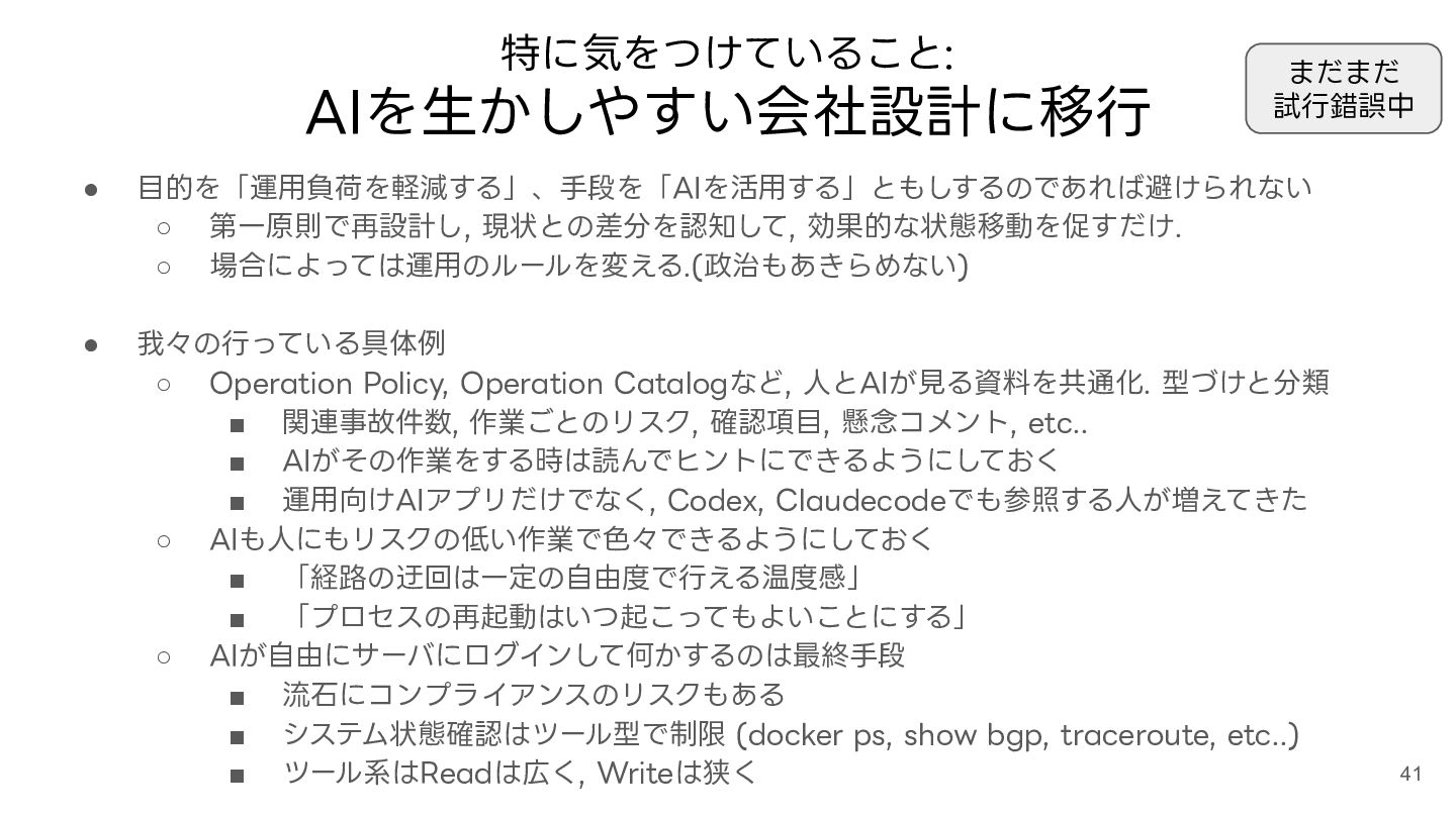 場合によっては運⽤のルールを変える.(政治もあきらめない) • 我々の⾏っている具体例 ◦ Operation Policy, Operation Catalogなど, ⼈とAIが⾒る資料を共通化. 型づけと分類 ▪ 関連事故件数, 作業ごとのリスク, 確認項⽬, 懸念コメント, etc.. ▪ AIがその作業をする時は読んでヒントにできるようにしておく ▪ 運⽤向けAIアプリだけでなく, Codex, Claudecodeでも参照する⼈が増えてきた ◦ AIも⼈にもリスクの低い作業で⾊々できるようにしておく ▪ 「経路の迂回は⼀定の⾃由度で⾏える温度感」 ▪ 「プロセスの再起動はいつ起こってもよいことにする」 ◦ AIが⾃由にサーバにログインして何かするのは最終⼿段 ▪ 流⽯にコンプライアンスのリスクもある ▪ システム状態確認はツール型で制限 (docker ps, show bgp, traceroute, etc..) ▪ ツール系はReadは広く, Writeは狭く まだまだ 試⾏錯誤中