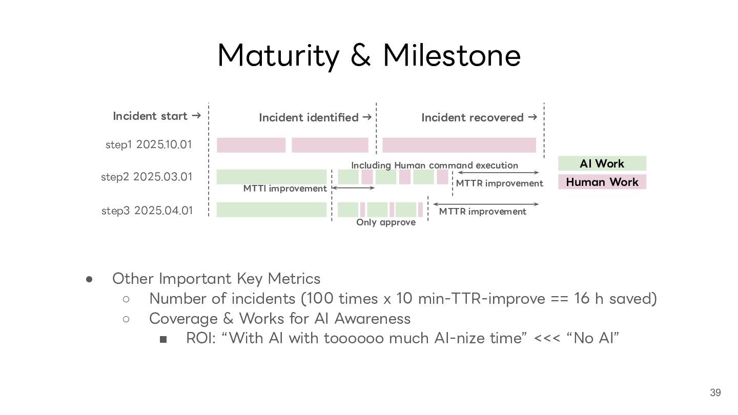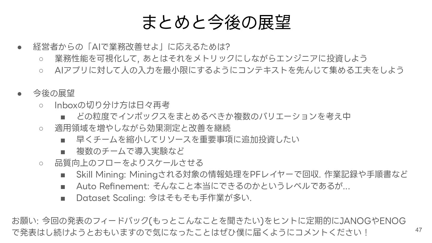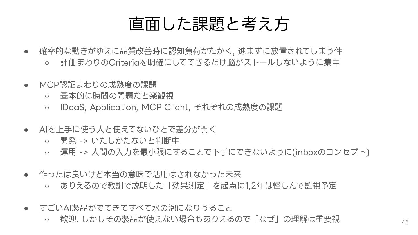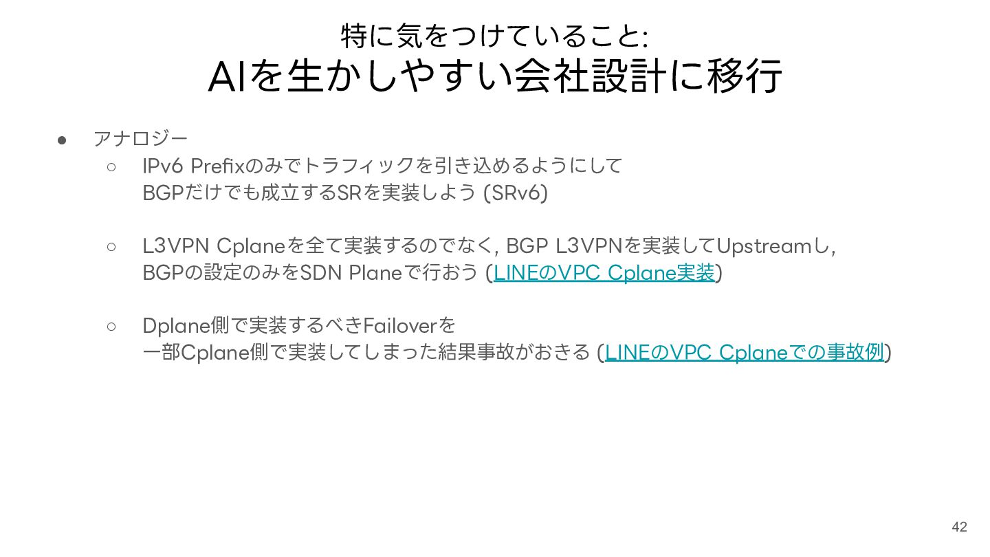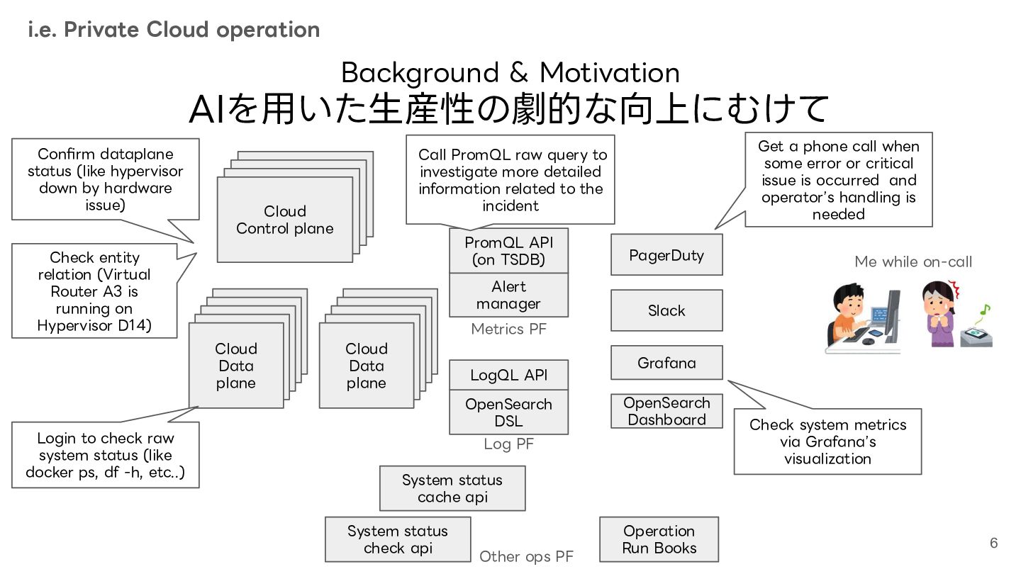場合によっては運⽤のルールを変える.(政治もあきらめない) • 我々の⾏っている具体例 ◦ Operation Policy, Operation Catalogなど, ⼈とAIが⾒る資料を共通化. 型づけと分類 ▪ 関連事故件数, 作業ごとのリスク, 確認項⽬, 懸念コメント, etc.. ▪ AIがその作業をする時は読んでヒントにできるようにしておく ▪ 運⽤向けAIアプリだけでなく, Codex, Claudecodeでも参照する⼈が増えてきた ◦ AIも⼈にもリスクの低い作業で⾊々できるようにしておく ▪ 「経路の迂回は⼀定の⾃由度で⾏える温度感」 ▪ 「プロセスの再起動はいつ起こってもよいことにする」 ◦ AIが⾃由にサーバにログインして何かするのは最終⼿段 ▪ 流⽯にコンプライアンスのリスクもある ▪ システム状態確認はツール型で制限 (docker ps, show bgp, traceroute, etc..) ▪ ツール系はReadは広く, Writeは狭く まだまだ 試⾏錯誤中