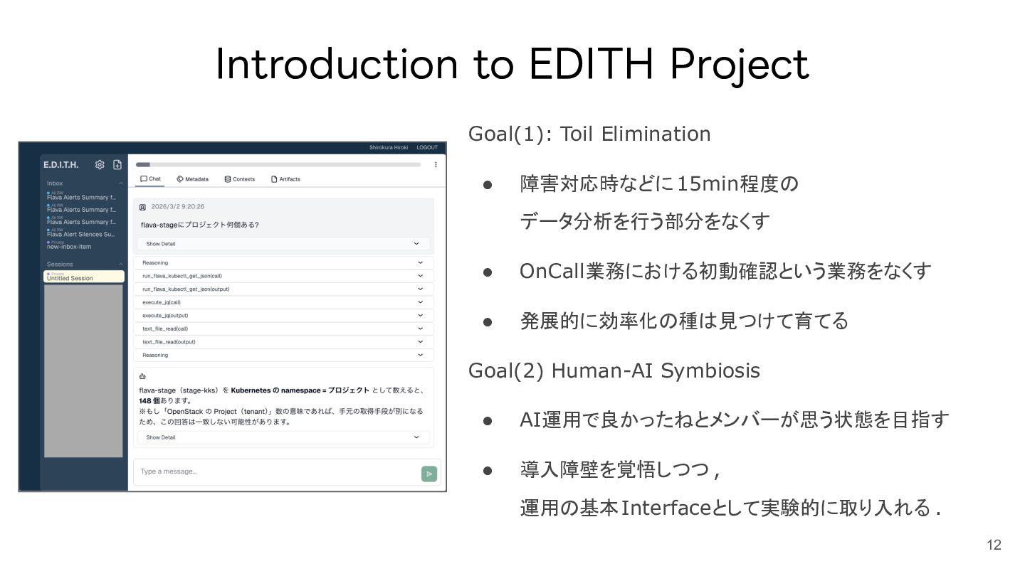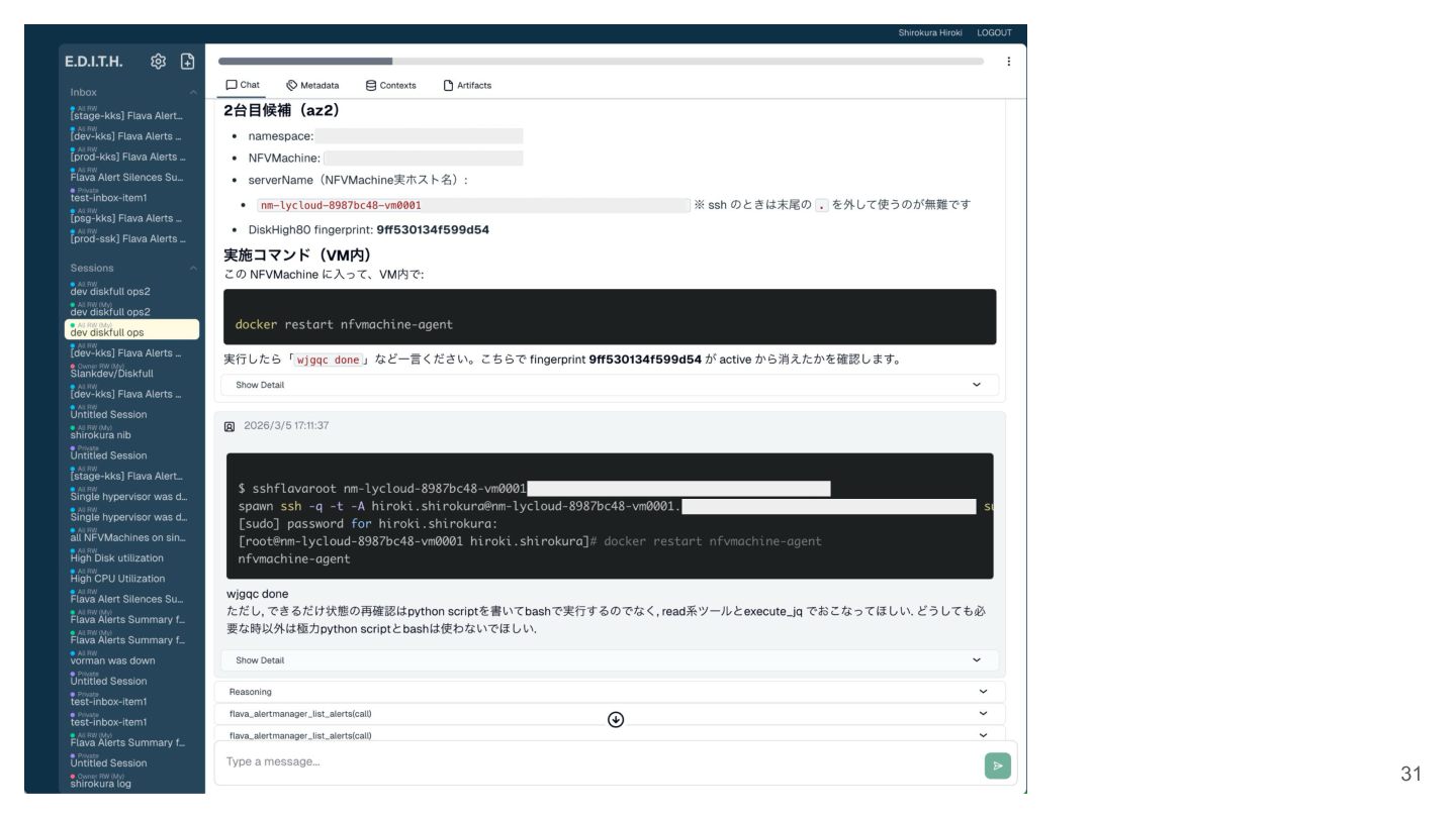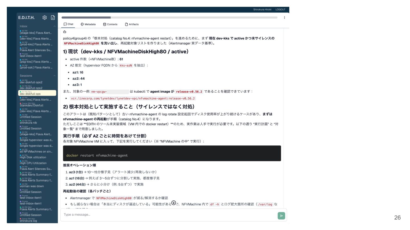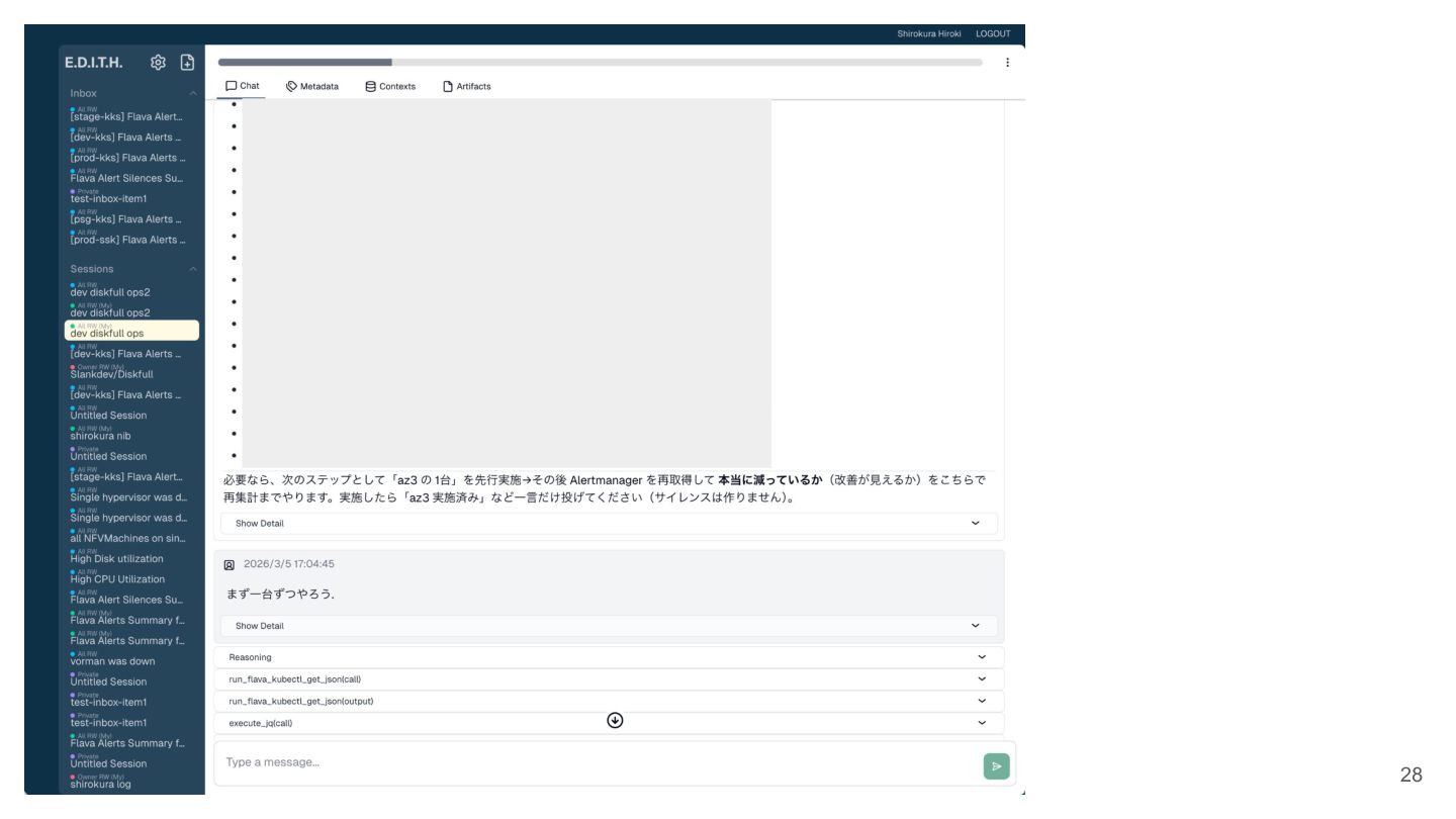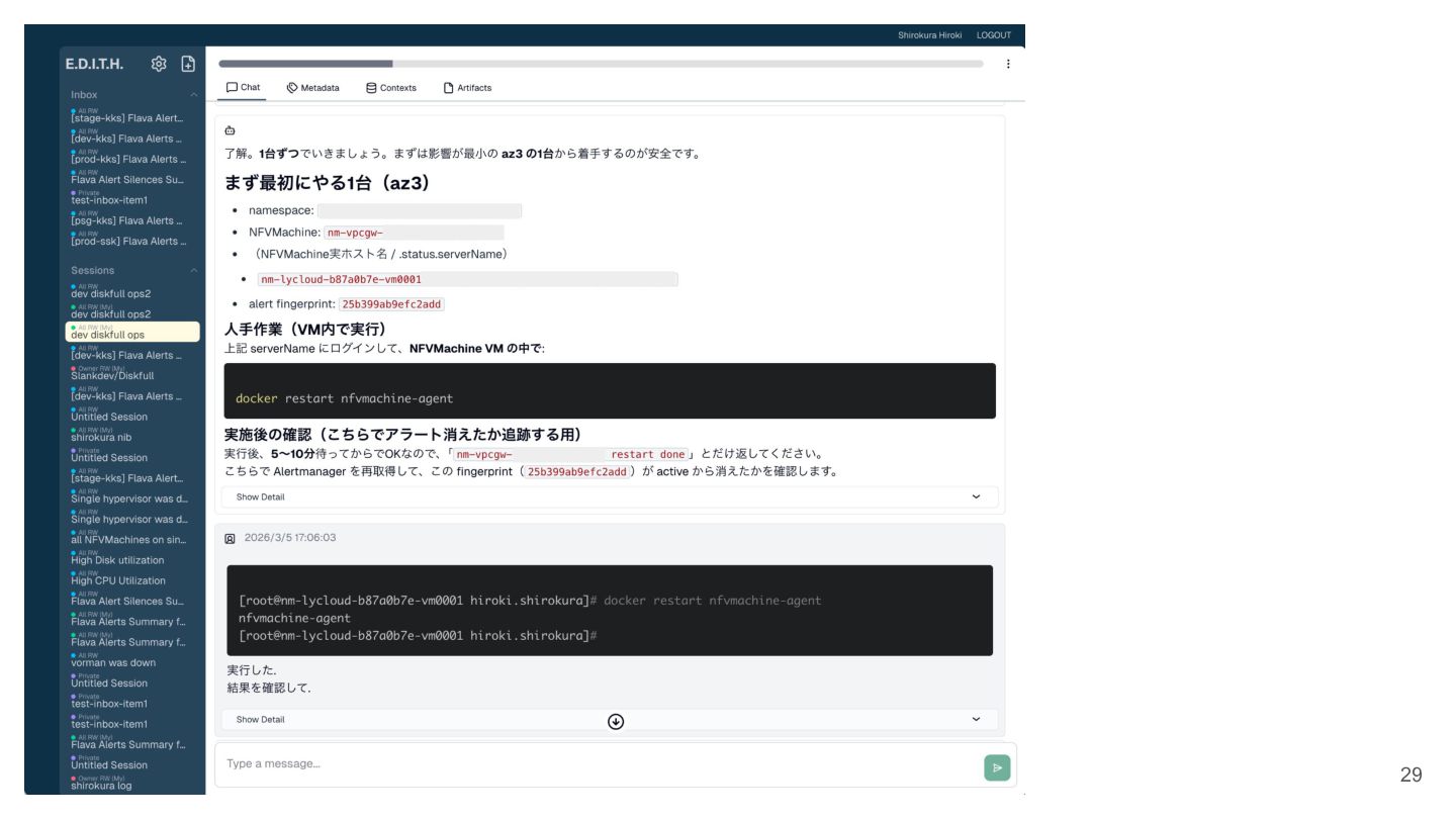 場合によっては運⽤のルールを変える.(政治もあきらめない) • 我々の⾏っている具体例 ◦ Operation Policy, Operation Catalogなど, ⼈とAIが⾒る資料を共通化. 型づけと分類 ▪ 関連事故件数, 作業ごとのリスク, 確認項⽬, 懸念コメント, etc.. ▪ AIがその作業をする時は読んでヒントにできるようにしておく ▪ 運⽤向けAIアプリだけでなく, Codex, Claudecodeでも参照する⼈が増えてきた ◦ AIも⼈にもリスクの低い作業で⾊々できるようにしておく ▪ 「経路の迂回は⼀定の⾃由度で⾏える温度感」 ▪ 「プロセスの再起動はいつ起こってもよいことにする」 ◦ AIが⾃由にサーバにログインして何かするのは最終⼿段 ▪ 流⽯にコンプライアンスのリスクもある ▪ システム状態確認はツール型で制限 (docker ps, show bgp, traceroute, etc..) ▪ ツール系はReadは広く, Writeは狭く まだまだ 試⾏錯誤中