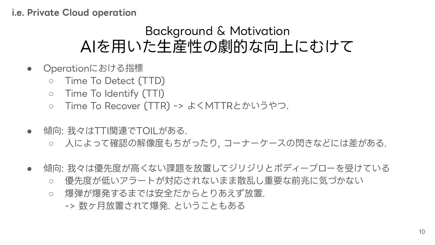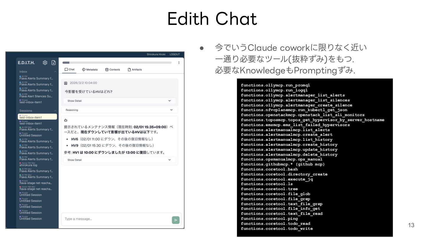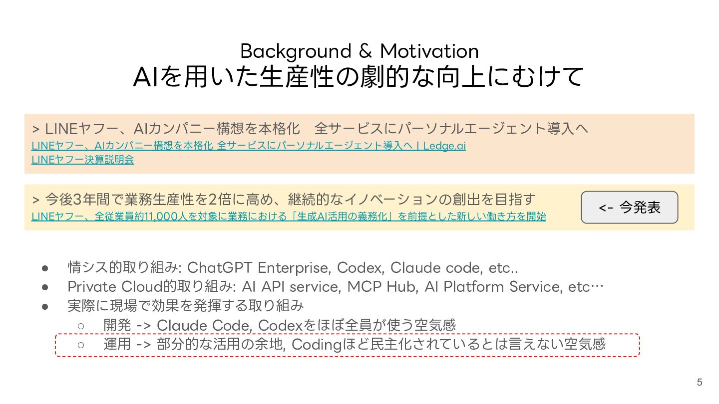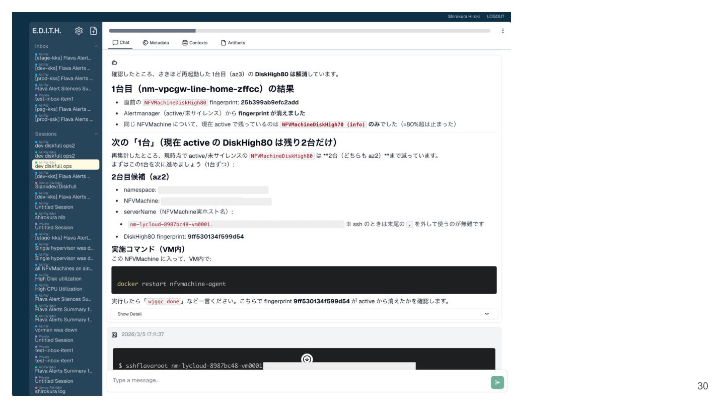 場合によっては運⽤のルールを変える.(政治もあきらめない) • 我々の⾏っている具体例 ◦ Operation Policy, Operation Catalogなど, ⼈とAIが⾒る資料を共通化. 型づけと分類 ▪ 関連事故件数, 作業ごとのリスク, 確認項⽬, 懸念コメント, etc.. ▪ AIがその作業をする時は読んでヒントにできるようにしておく ▪ 運⽤向けAIアプリだけでなく, Codex, Claudecodeでも参照する⼈が増えてきた ◦ AIも⼈にもリスクの低い作業で⾊々できるようにしておく ▪ 「経路の迂回は⼀定の⾃由度で⾏える温度感」 ▪ 「プロセスの再起動はいつ起こってもよいことにする」 ◦ AIが⾃由にサーバにログインして何かするのは最終⼿段 ▪ 流⽯にコンプライアンスのリスクもある ▪ システム状態確認はツール型で制限 (docker ps, show bgp, traceroute, etc..) ▪ ツール系はReadは広く, Writeは狭く まだまだ 試⾏錯誤中