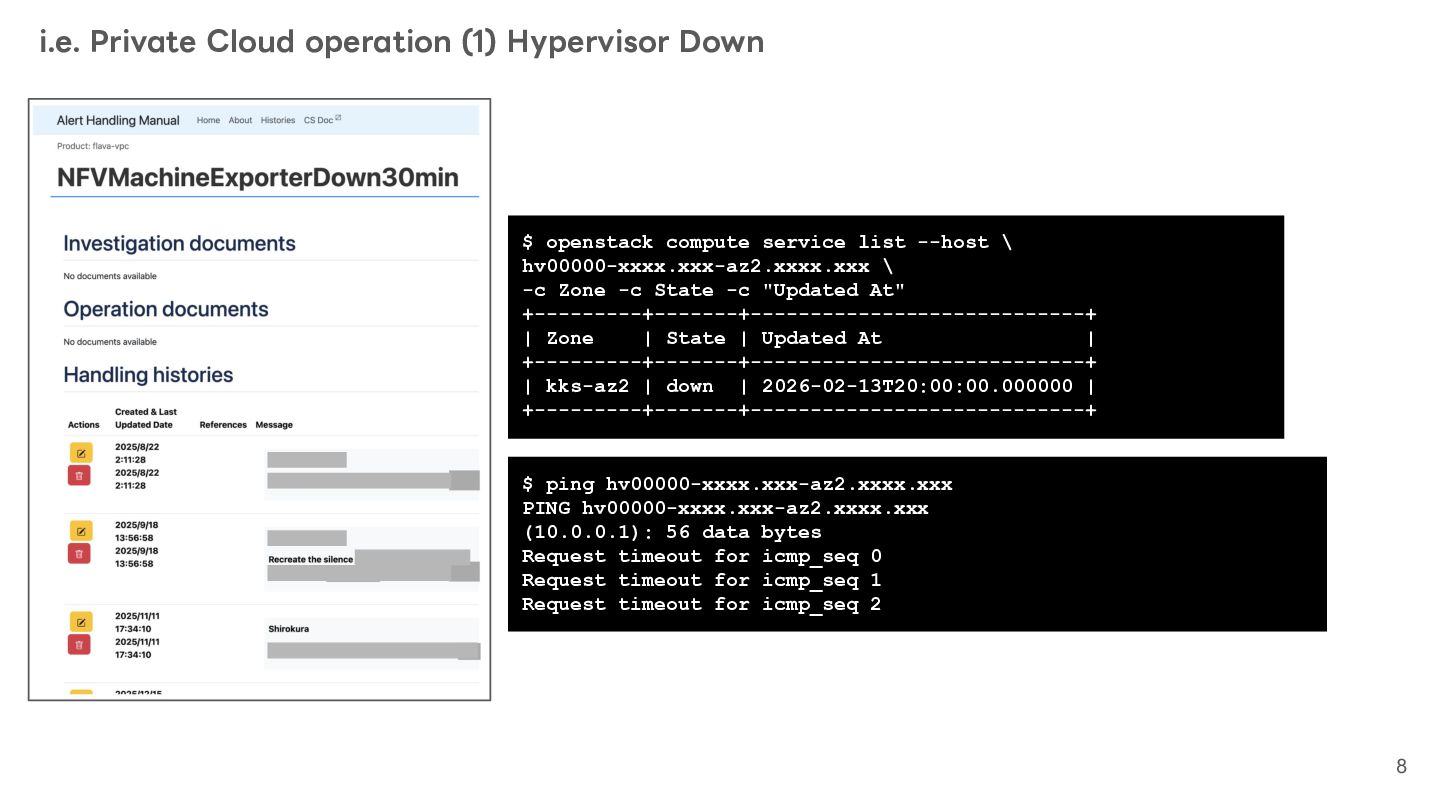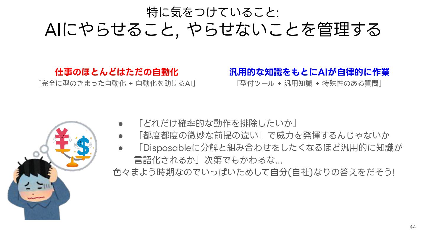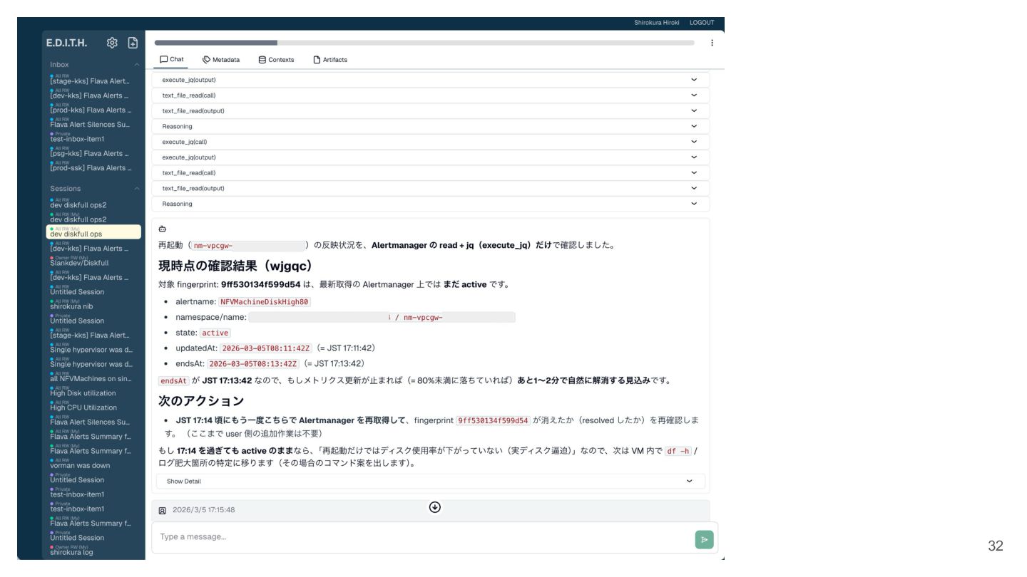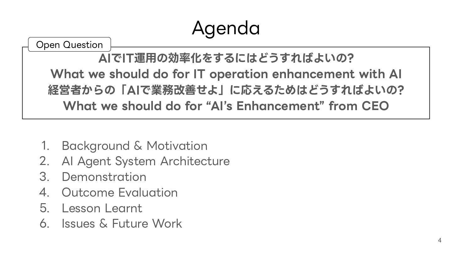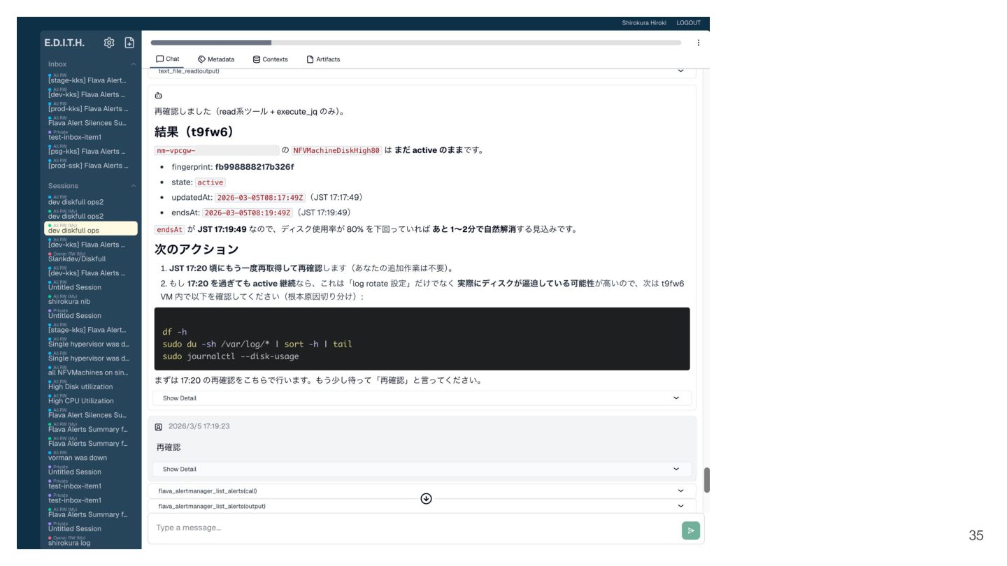場合によっては運⽤のルールを変える.(政治もあきらめない) • 我々の⾏っている具体例 ◦ Operation Policy, Operation Catalogなど, ⼈とAIが⾒る資料を共通化. 型づけと分類 ▪ 関連事故件数, 作業ごとのリスク, 確認項⽬, 懸念コメント, etc.. ▪ AIがその作業をする時は読んでヒントにできるようにしておく ▪ 運⽤向けAIアプリだけでなく, Codex, Claudecodeでも参照する⼈が増えてきた ◦ AIも⼈にもリスクの低い作業で⾊々できるようにしておく ▪ 「経路の迂回は⼀定の⾃由度で⾏える温度感」 ▪ 「プロセスの再起動はいつ起こってもよいことにする」 ◦ AIが⾃由にサーバにログインして何かするのは最終⼿段 ▪ 流⽯にコンプライアンスのリスクもある ▪ システム状態確認はツール型で制限 (docker ps, show bgp, traceroute, etc..) ▪ ツール系はReadは広く, Writeは狭く まだまだ 試⾏錯誤中