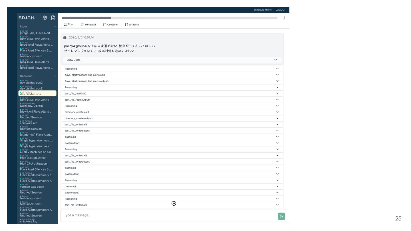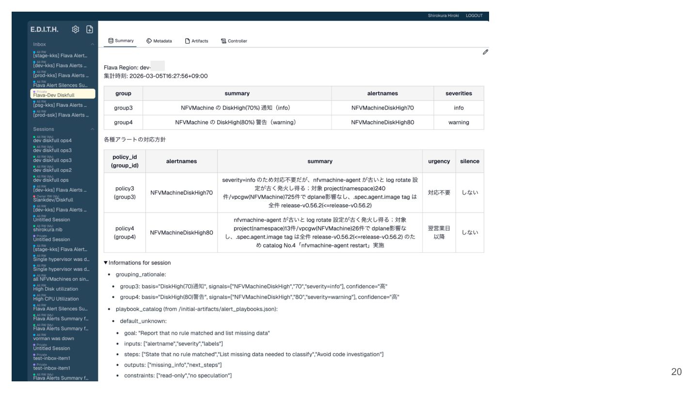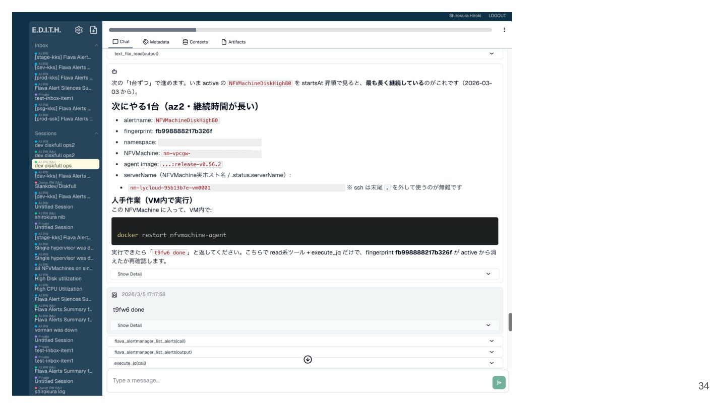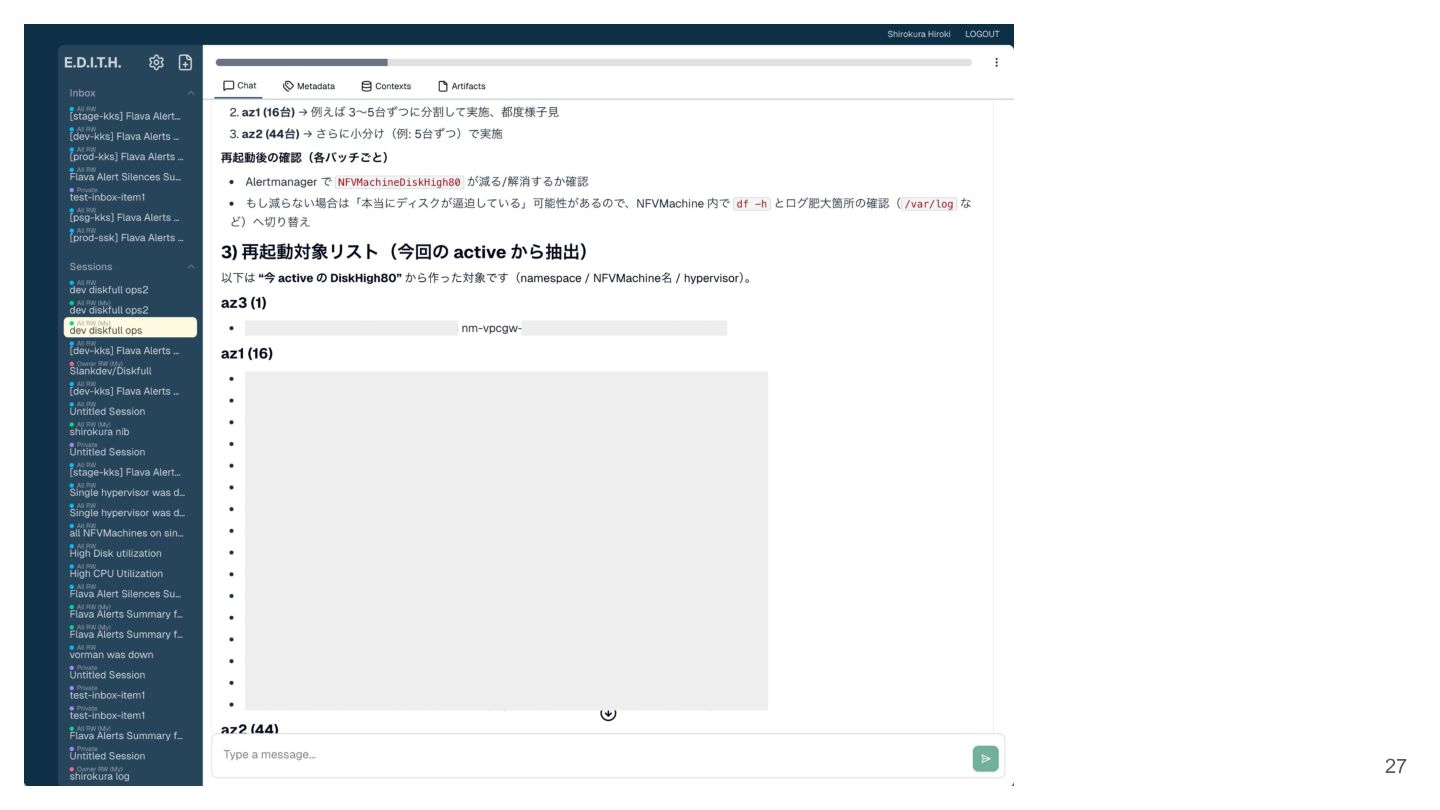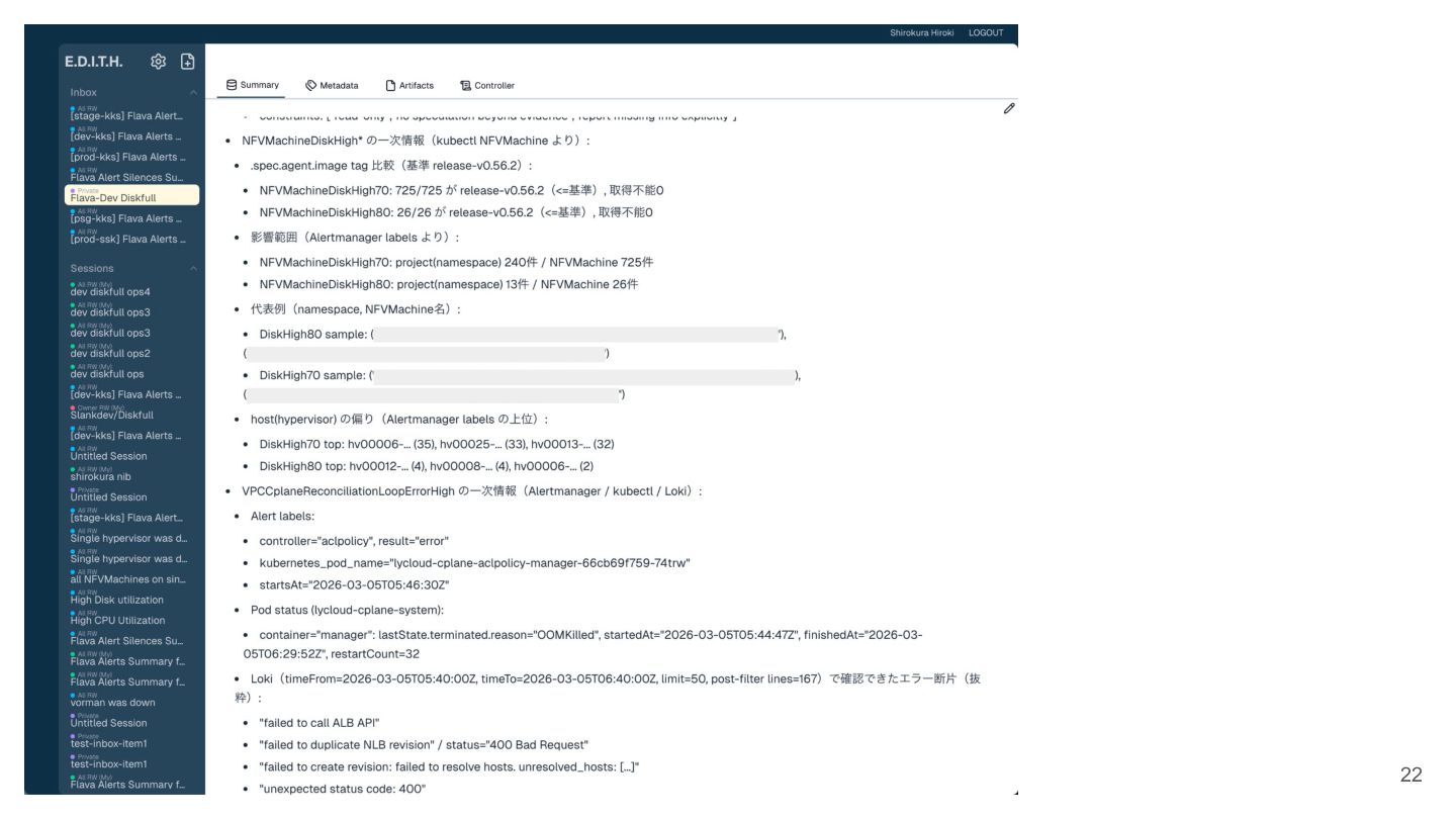 場合によっては運⽤のルールを変える.(政治もあきらめない) • 我々の⾏っている具体例 ◦ Operation Policy, Operation Catalogなど, ⼈とAIが⾒る資料を共通化. 型づけと分類 ▪ 関連事故件数, 作業ごとのリスク, 確認項⽬, 懸念コメント, etc.. ▪ AIがその作業をする時は読んでヒントにできるようにしておく ▪ 運⽤向けAIアプリだけでなく, Codex, Claudecodeでも参照する⼈が増えてきた ◦ AIも⼈にもリスクの低い作業で⾊々できるようにしておく ▪ 「経路の迂回は⼀定の⾃由度で⾏える温度感」 ▪ 「プロセスの再起動はいつ起こってもよいことにする」 ◦ AIが⾃由にサーバにログインして何かするのは最終⼿段 ▪ 流⽯にコンプライアンスのリスクもある ▪ システム状態確認はツール型で制限 (docker ps, show bgp, traceroute, etc..) ▪ ツール系はReadは広く, Writeは狭く まだまだ 試⾏錯誤中
