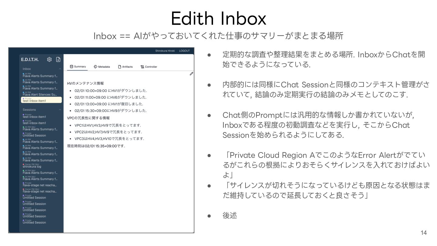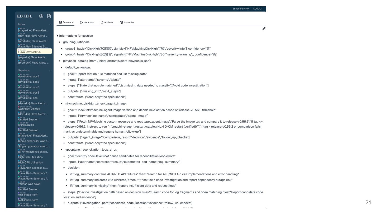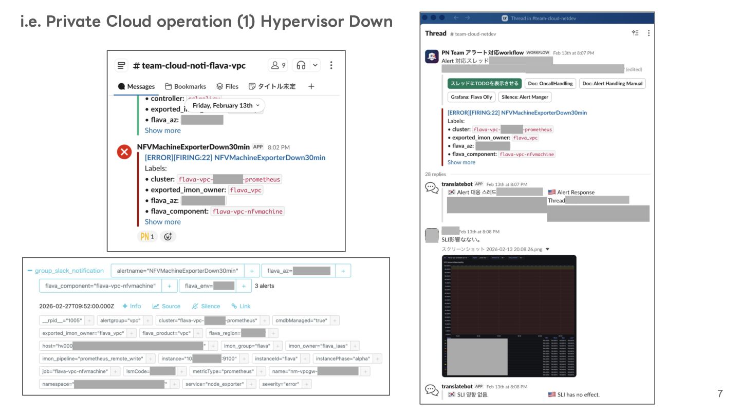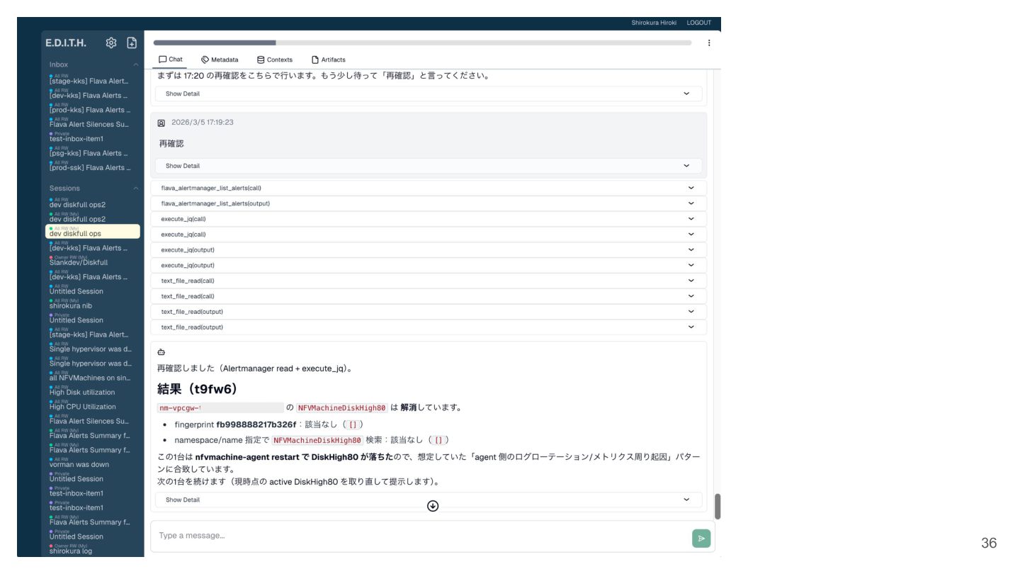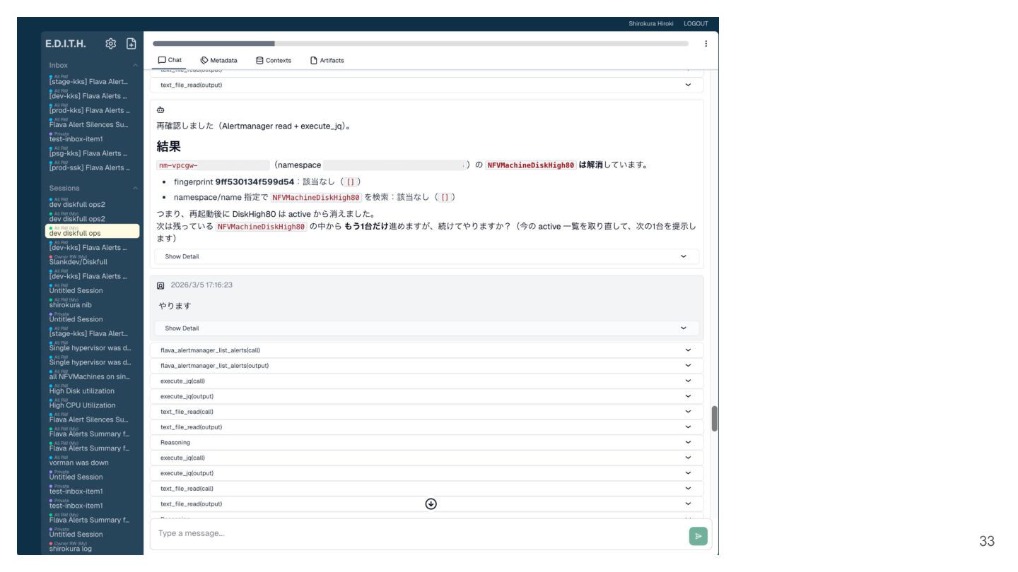 場合によっては運⽤のルールを変える.(政治もあきらめない) • 我々の⾏っている具体例 ◦ Operation Policy, Operation Catalogなど, ⼈とAIが⾒る資料を共通化. 型づけと分類 ▪ 関連事故件数, 作業ごとのリスク, 確認項⽬, 懸念コメント, etc.. ▪ AIがその作業をする時は読んでヒントにできるようにしておく ▪ 運⽤向けAIアプリだけでなく, Codex, Claudecodeでも参照する⼈が増えてきた ◦ AIも⼈にもリスクの低い作業で⾊々できるようにしておく ▪ 「経路の迂回は⼀定の⾃由度で⾏える温度感」 ▪ 「プロセスの再起動はいつ起こってもよいことにする」 ◦ AIが⾃由にサーバにログインして何かするのは最終⼿段 ▪ 流⽯にコンプライアンスのリスクもある ▪ システム状態確認はツール型で制限 (docker ps, show bgp, traceroute, etc..) ▪ ツール系はReadは広く, Writeは狭く まだまだ 試⾏錯誤中