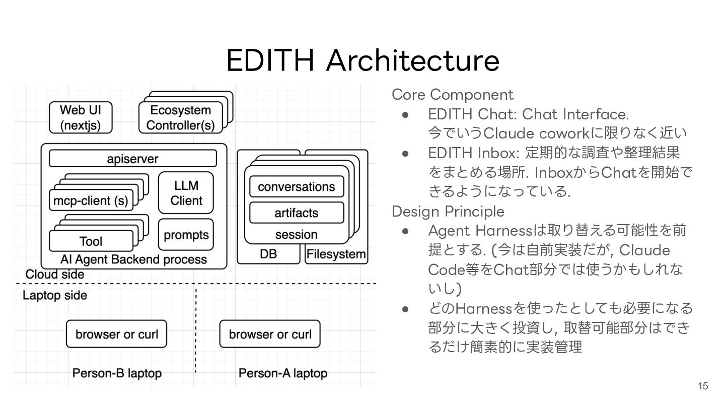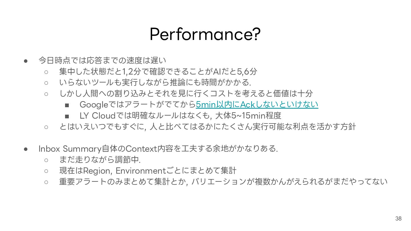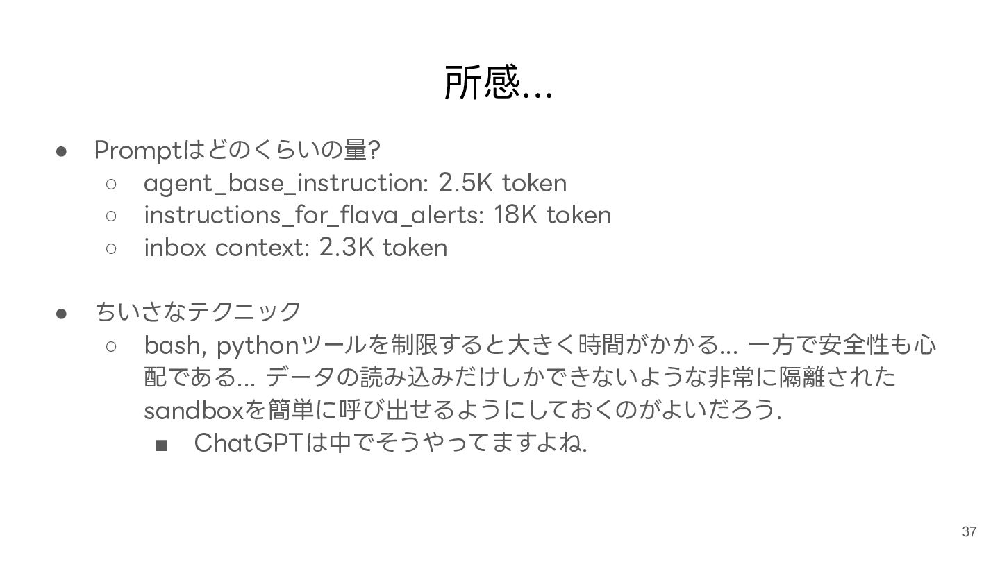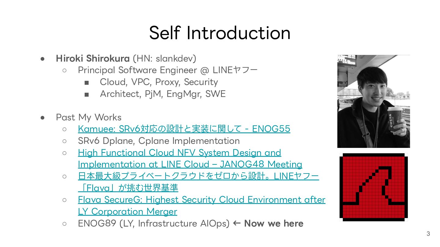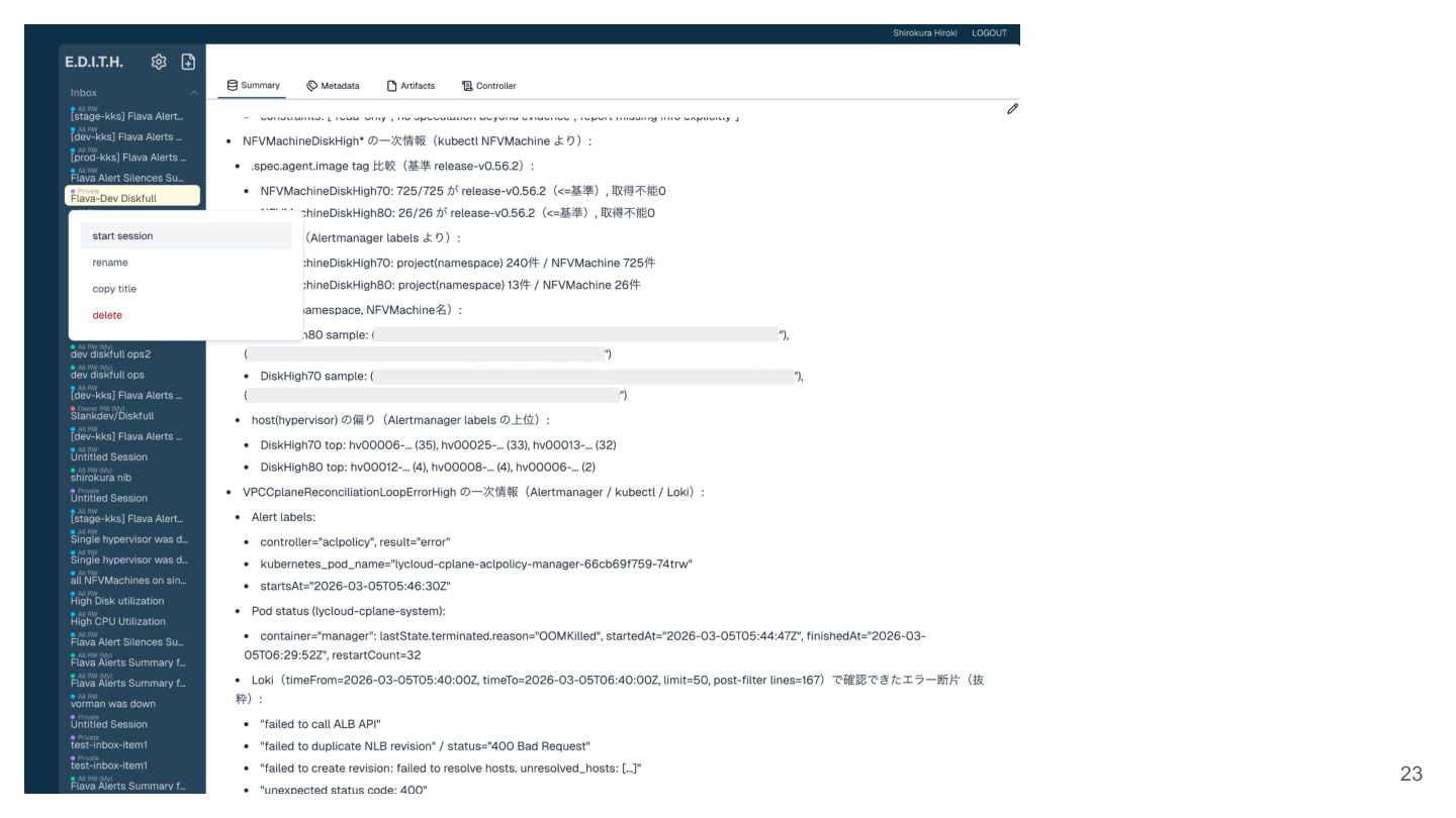 場合によっては運⽤のルールを変える.(政治もあきらめない) • 我々の⾏っている具体例 ◦ Operation Policy, Operation Catalogなど, ⼈とAIが⾒る資料を共通化. 型づけと分類 ▪ 関連事故件数, 作業ごとのリスク, 確認項⽬, 懸念コメント, etc.. ▪ AIがその作業をする時は読んでヒントにできるようにしておく ▪ 運⽤向けAIアプリだけでなく, Codex, Claudecodeでも参照する⼈が増えてきた ◦ AIも⼈にもリスクの低い作業で⾊々できるようにしておく ▪ 「経路の迂回は⼀定の⾃由度で⾏える温度感」 ▪ 「プロセスの再起動はいつ起こってもよいことにする」 ◦ AIが⾃由にサーバにログインして何かするのは最終⼿段 ▪ 流⽯にコンプライアンスのリスクもある ▪ システム状態確認はツール型で制限 (docker ps, show bgp, traceroute, etc..) ▪ ツール系はReadは広く, Writeは狭く まだまだ 試⾏錯誤中